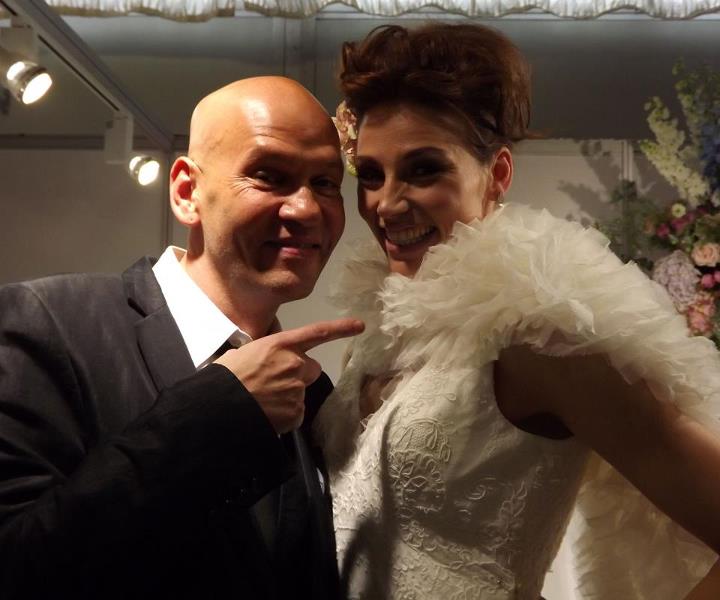 lo stilista Ian Stuart con modella in abito da sposa 2013 Supernova backstage Photo Ian Stuart on Facebook