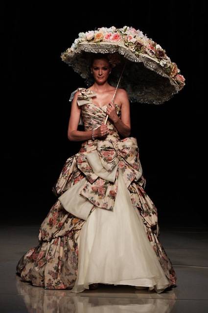 Stessa cromia per Claridges, che rievoca nuovamente lo stile alla Maria Antoinetta tanto caro a Ian Stuart e già portato al trionfo con le collezioni 2012: in jacquard a fiori e pizzo, l'abito ha corpetto strutturato, gonna increspata e bolero con polsini vintage e fiocchi.
