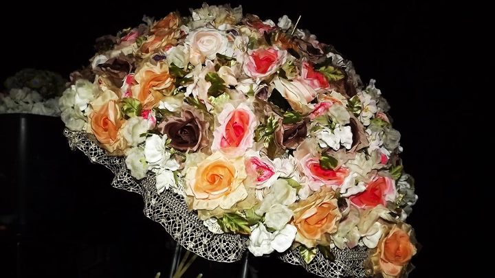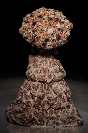 Le pieghettature e le applicazioni floreali sono anche sul retro e applicate sul capo.