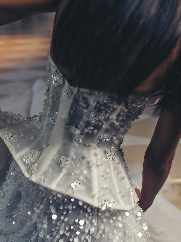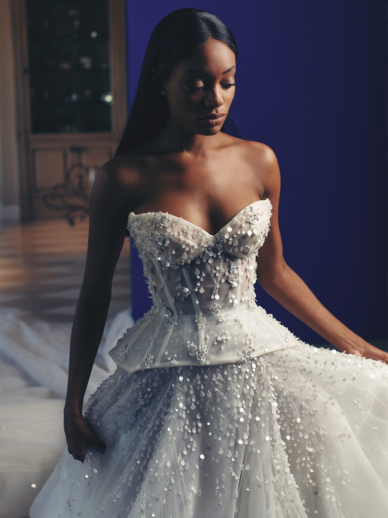 Toni cipria e avorio per l’abito da sposa “Charm”, un abito con corpetto a baschina dallo scollo a cuore, completamente tempestato di punti luce e paillettes a goccia, per un effetto davvero glam.