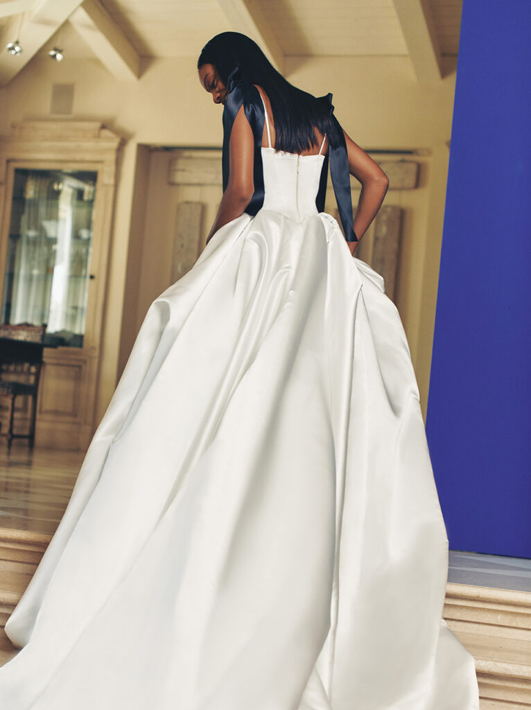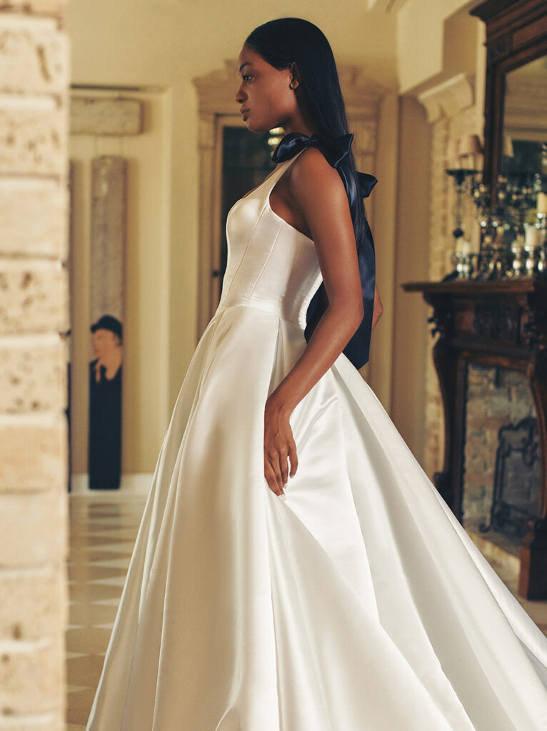 Per la sposa tradizionale, perfetto l’abito “Dove”, un abito da sposa regale in raso con un corsetto dalla scollatura quadrata e accenti di fiocco in raso nero. Il corsetto sfocia in una voluminosa gonna a cattedrale in raso a pieghe, elegante senza essere eccessiva.