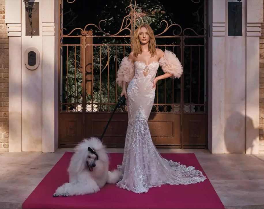 Guardando gli abiti da sposa a sirena, assolutamente spettacolare è l’abito “Fleur”, un abito da sposa bohemien e dal “romanticismo rustico” velato, abbellito da fiori 3D e pizzo crochet, con un profondo scollo a V. All’abito sono applicate maniche in tulle Point d'esprit dal grande volume e lunghezza, in grado di sostituire il velo.