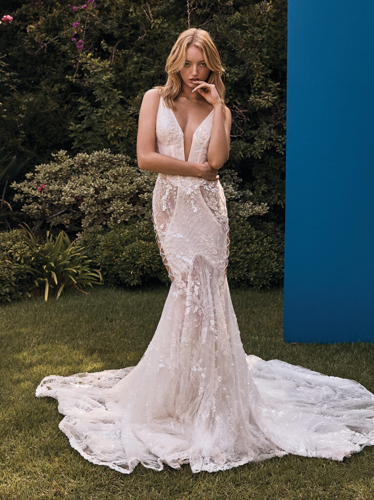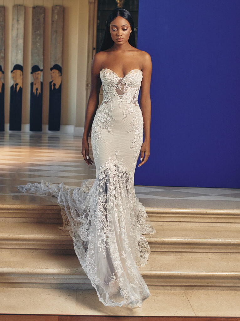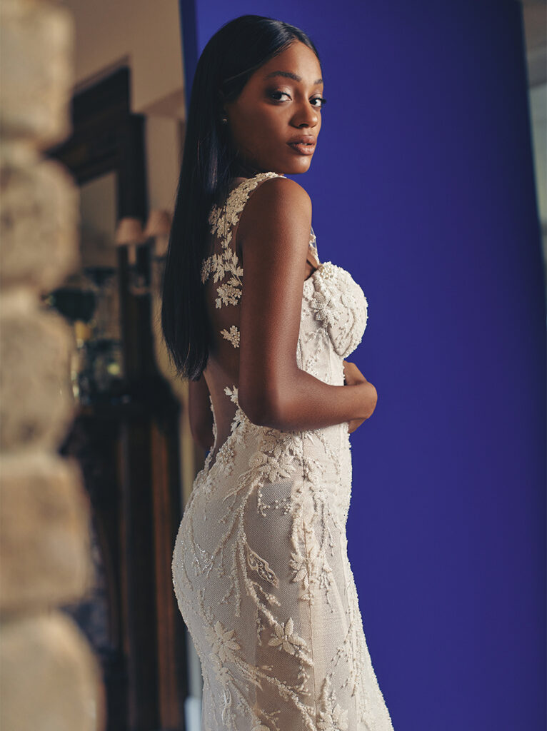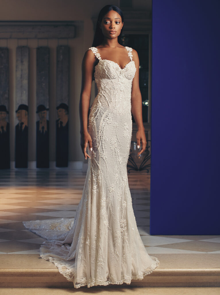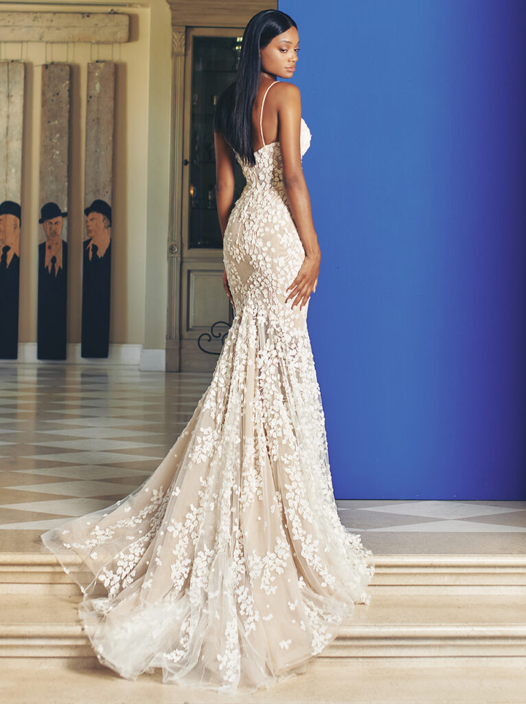 Sempre rimanendo negli abiti da sposa a sirena, davvero a sorpresa è l’abito “Suri” in tulle, abbellito da ricami lucenti, per un look davvero da diva di Hollywood. Il corpetto a cuore con spalline, la schiena bassa e i dettagli floreali completamente ricamati rendono questo splendido abito perfetto per un matrimonio davvero romantico. L’abito può essere completato da un sontuoso strascico con grande fiocco oppure da un ampio velo.