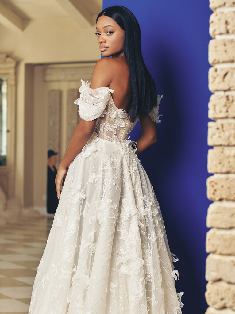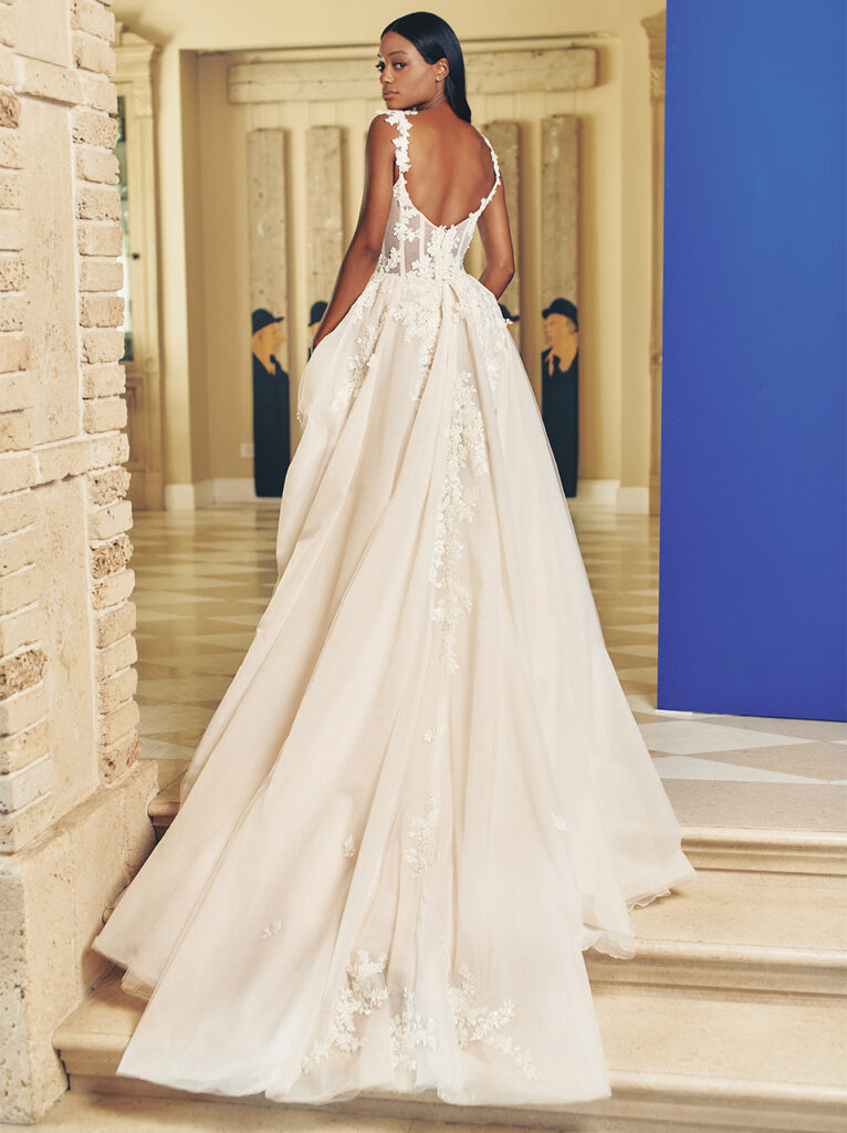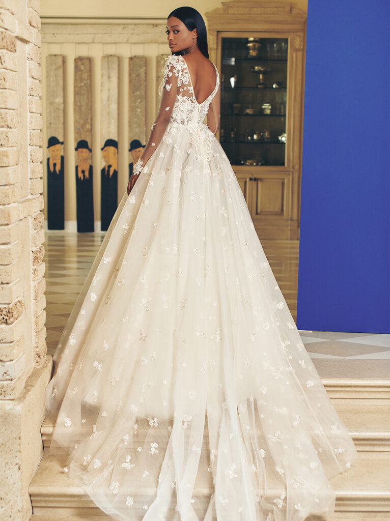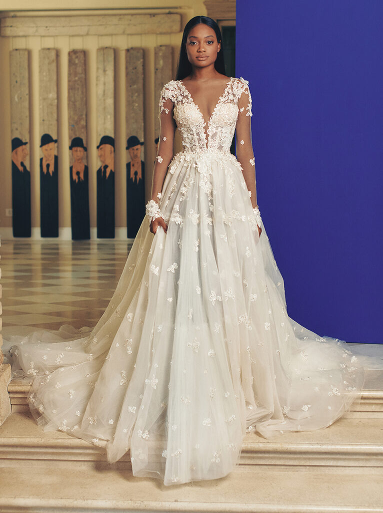 Gran chiusura con l’abito da sposa “Poet”, una vera poesia, come racconta il brand: “La moda incontra la fiaba in questo contemporaneo top con corpetto a V e gonna ballgown da principessa. Le maniche aderenti trasparenti e una gonna voluminosa a due livelli, tulle ricamato con mini ricami floreali e punteggiata da fiori di organza 3D, fanno di questo splendido abito un'opzione elegante per la sposa glam ma moderna”.