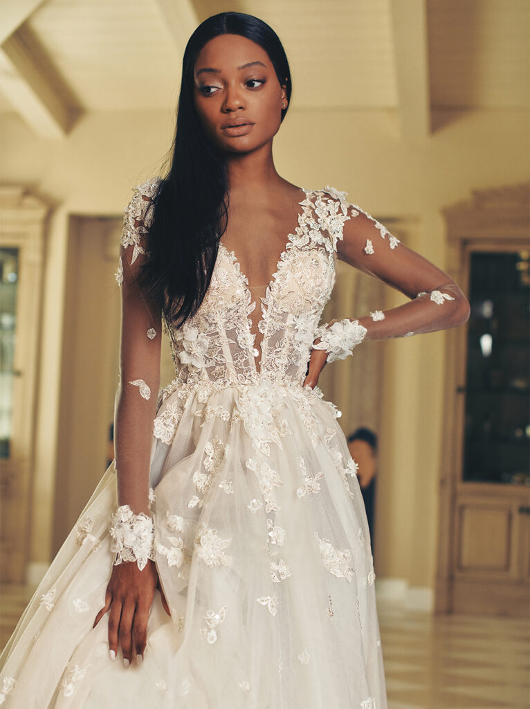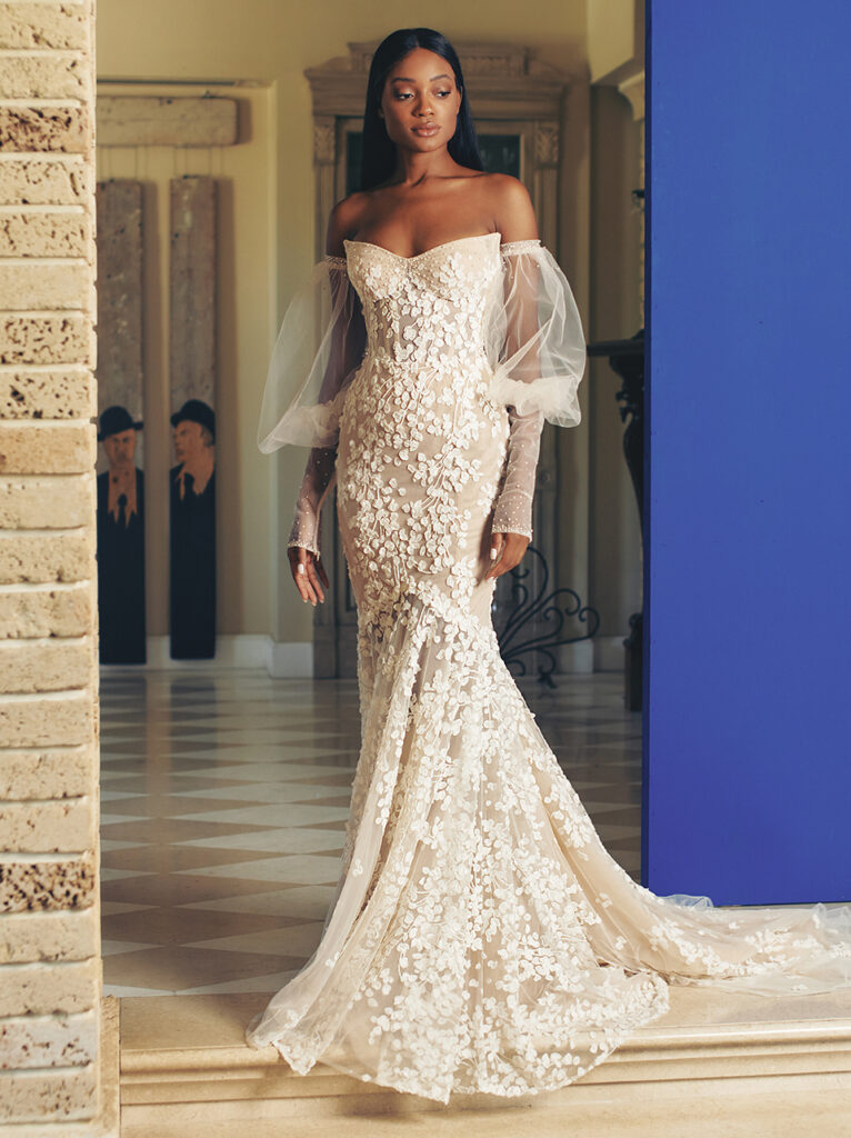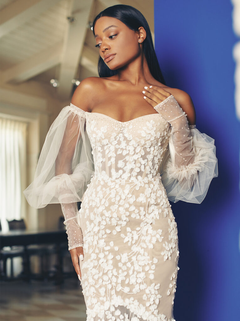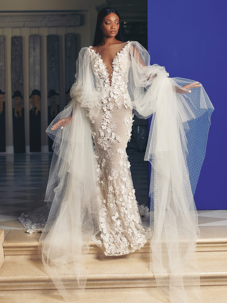 abito da sposa a sirena in tulle e ricami florali con maniche scultura Galia Lahav Fall 2022
