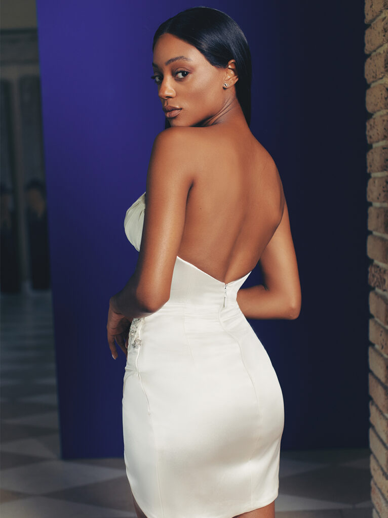 Davvero originale e perfetto come secondo abito da sposa per il party nuziale o come abito da sposa per nozze civili, l’abito da sposa corto “Loulou”, mini dress elegante, aderente e senza spalline, evidenziato da un ricamo e da un corsetto, che si drappeggia in una gonna avvolgente fatta di raso elastico brillante. L’abito è abbinato a una mantella in tulle rimovibile con scollo a barchetta e maniche a palloncino, per un look chic e sofisticato.