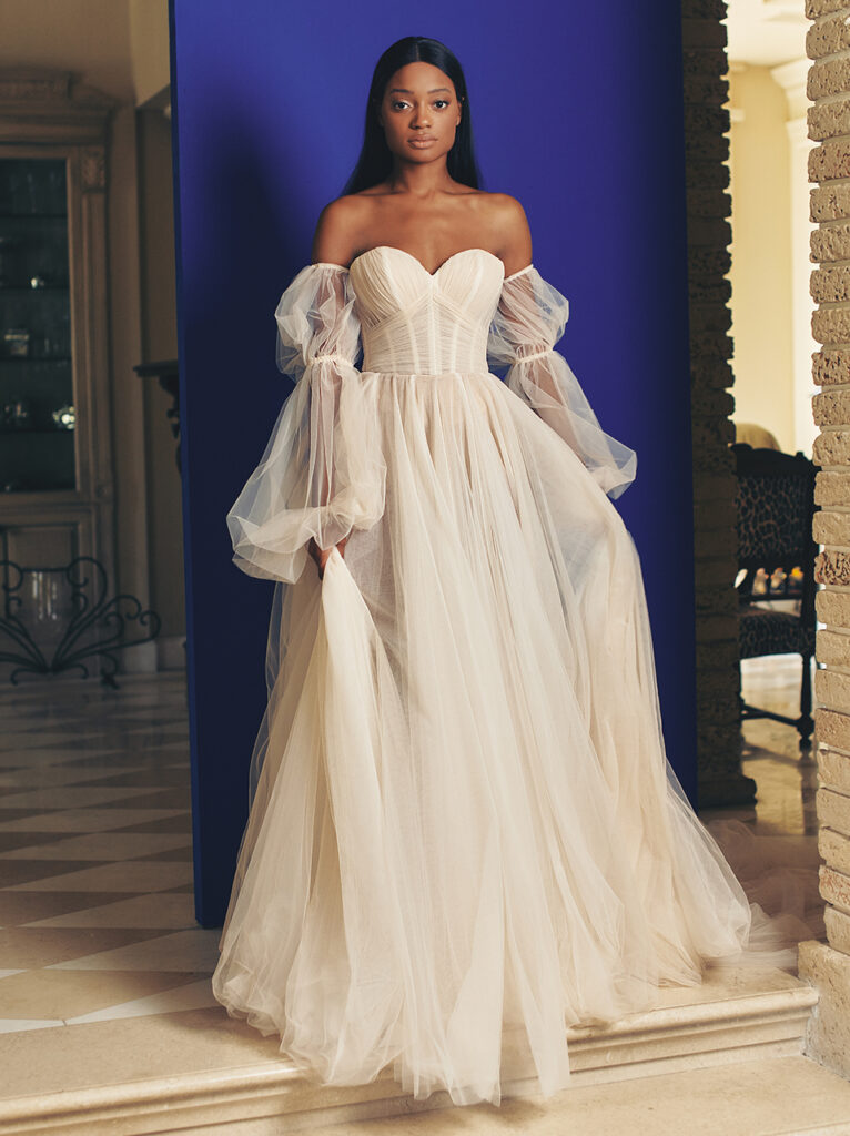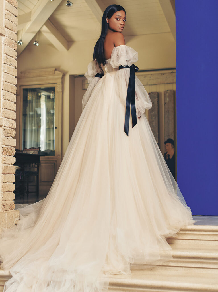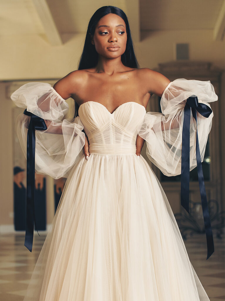 Accenni in nero anche per l’abito da sposa “Nouvelle”, di cui vale la pena riportare la descrizione fatta dal brand: “Basta aggiungere una carrozza trainata da cavalli a questo sognante abito in tulle di seta A-line per uno stile indubbiamente romantico, caratterizzato da un corpetto drappeggiato con scollo a cuore e maniche a sbuffo, chiuso da fiocchi di raso nero e da una gonna a palloncino in tulle bicolore color cipria e avorio. Volete saperne di più? Le maniche sono staccabili per un look alternativo due in uno facile da rimuovere!”