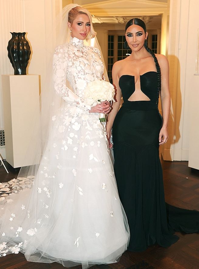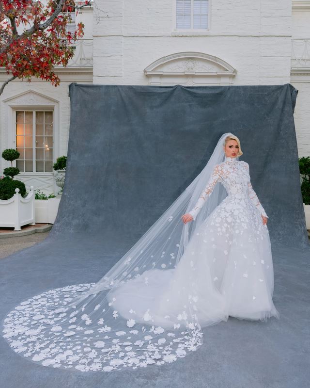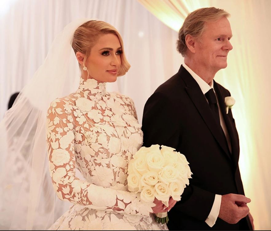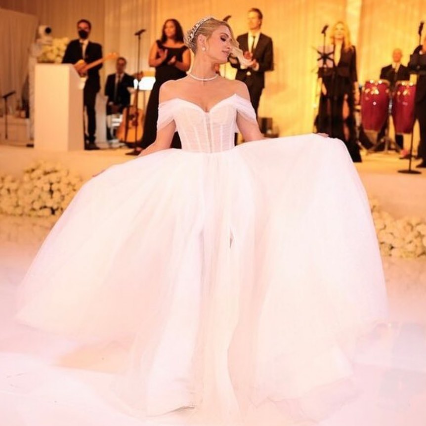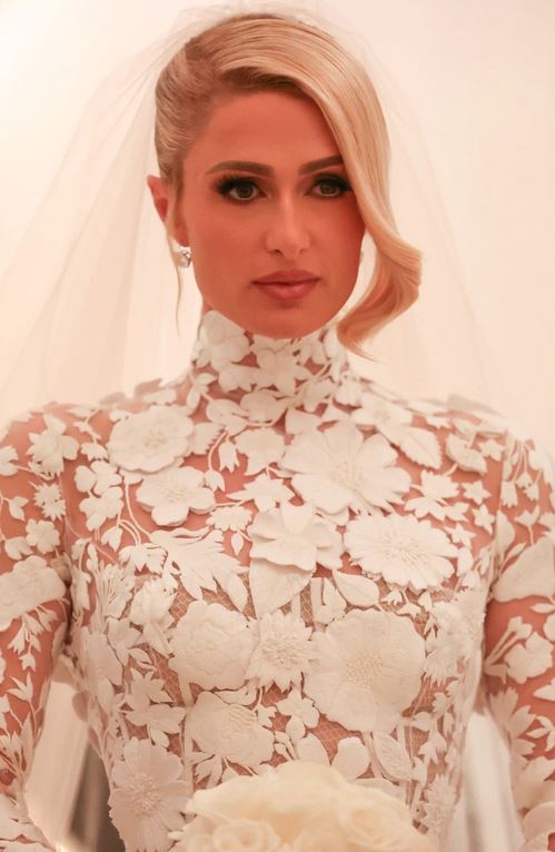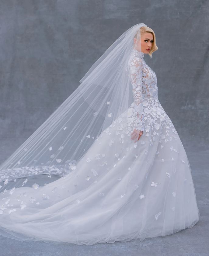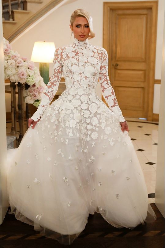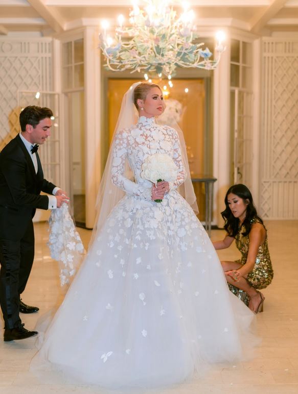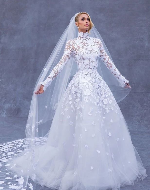Per la cerimonia nuziale, Paris Hilton ha scelto di indossare un abito da sposa Oscar de la Renta creato per lei dal team creativo Fernando Garcia e Laura Kim; una creazione palesemente ispirata all’abito da sposa di Grace Kelly, seguendo una scelta che fu già di sua sorella (guarda qui l’abito da sposa di Valentino indossato da Nicky Hilton).