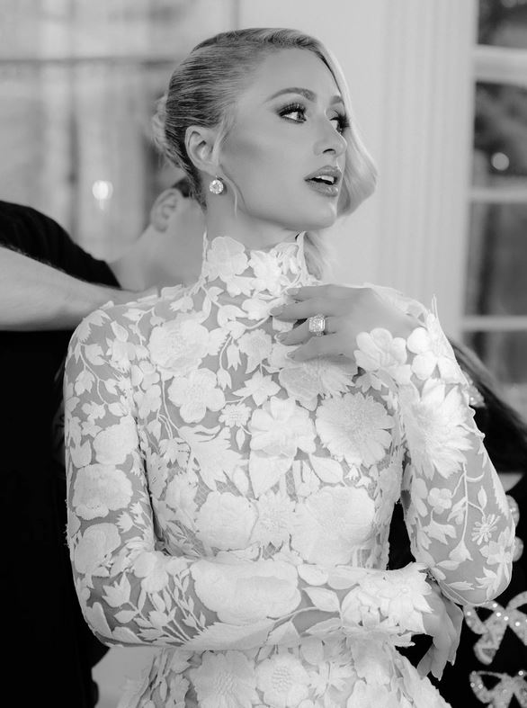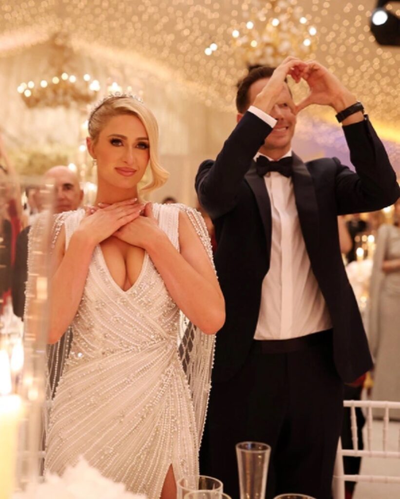 Al secondo party nuziale, Paris Hilton ha indossato un bellissimo abito Oscar de la Renta velato composto da una fitta trama di stelle argento cucite tra loro con profondo scollo a V, maniche lughe e spacco centrale, un modello scivolato super glam che, come racconta il brand, ha richiesto oltre 3000 ore di lavoro per la realizzazione dei ricami fatti a mano con la tecnica Aari.