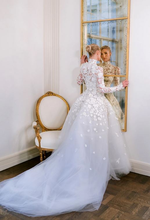 Il primo abito da sposa di Paris Hilton by Oscar de la Renta è un ball gown in tulle tempestato da ricami floreali 3D che si compongono fitti sul corpetto dal collo alto e maniche lunghe e proseguono a cascata sull’ampia gonna in tulle.
