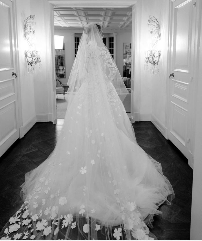 Sulla pagina Instagram di Oscar de la Renta vengono riportati alcuni dettagli del primo abito da sposa “realizzato nel nostro atelier di New York City con un turbinio di romantici fiori avorio pressati che cadono dalla classica scollatura. La sua gonna a palloncino è una prodezza tecnica con oltre 20 strati di tulle che si drappeggiano su una sottoveste di crinolina. Per realizzare il tutto, sono state necessarie 1.400 ore e il lavoro di otto sarte dell’atelier”.
