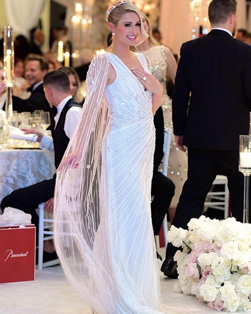 Terzo cambio d’abito al ricevimento: mentre Demi Lovato ha intrattenuto gli ospiti con una speciale performance di “I Will Always Love You”, Paris Hilton ha indossato un modello di Pamella Roland dalla silhouette a colonna molto avvolgente, con ampio scollo a V e spacco laterale, tempestato da perline e paillettes, abbinato ad una mantella in tulle e perline, e ad una tiara (nota passione dell’ereditiera). Un modello che ricorda le dive di Hollywood anni Trenta e Quaranta, davvero originale.