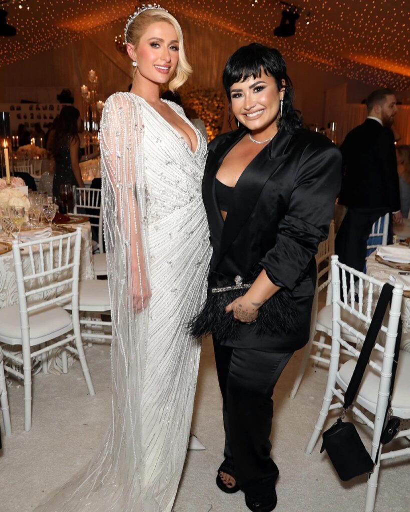 Paris Hilton sposa in Pamella Roland con Demi Lovato