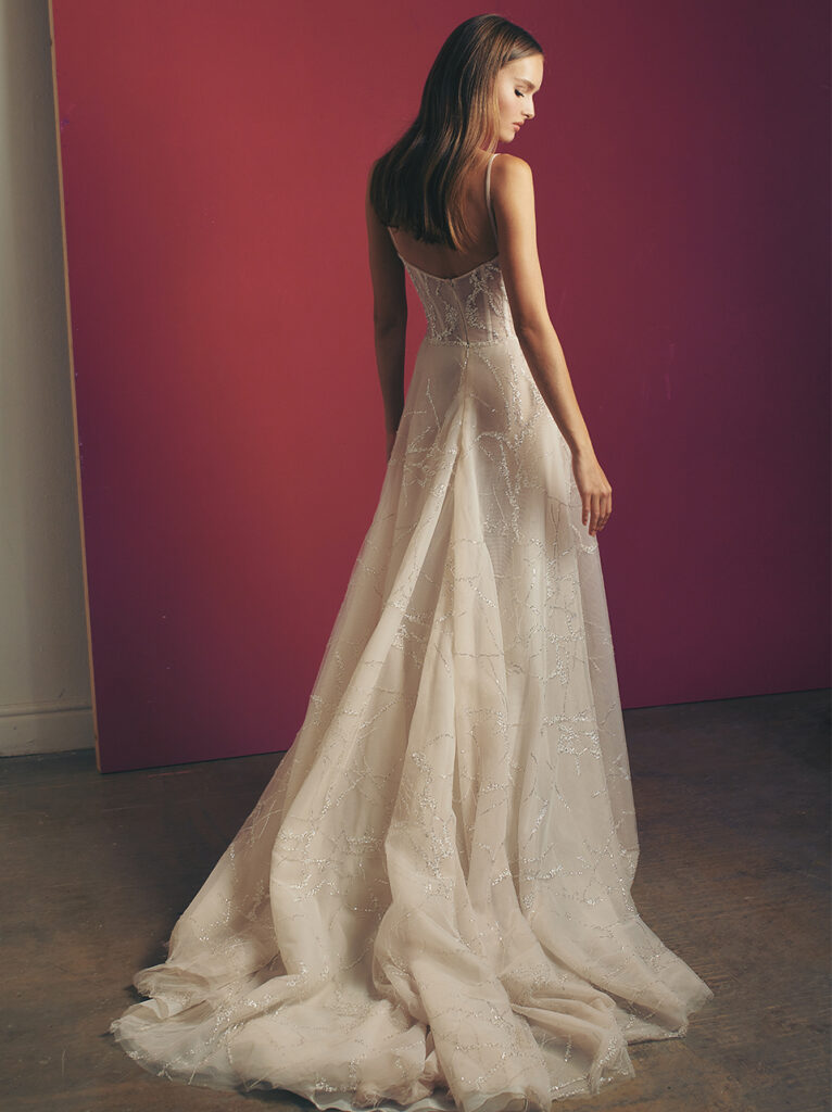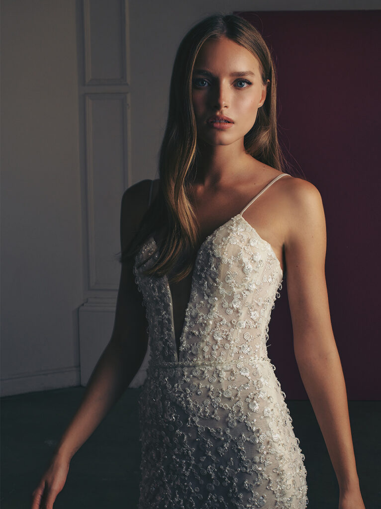 Da guardare con gli occhiali da sole “Becca”, abito da sposa aderente alla pelle con strascico, dal corpetto con profonda scollatura, spalline sottili e schiena aperta, un modello che brilla con eleganza, coperto di paillettes e ciondoli di cristalli.