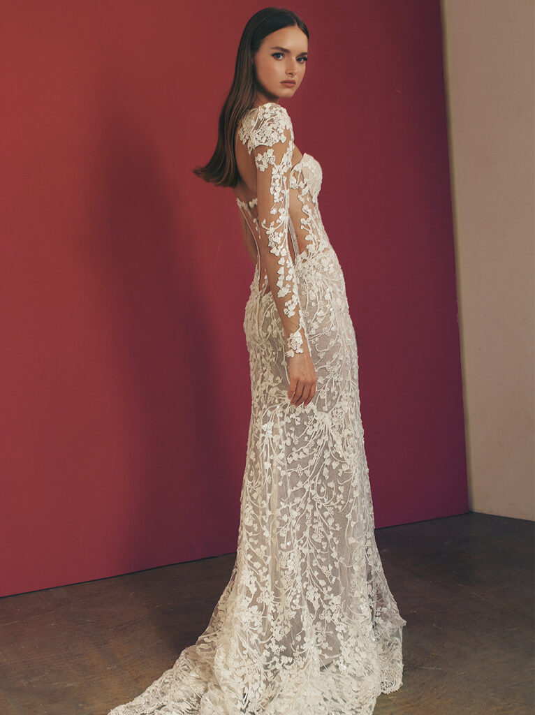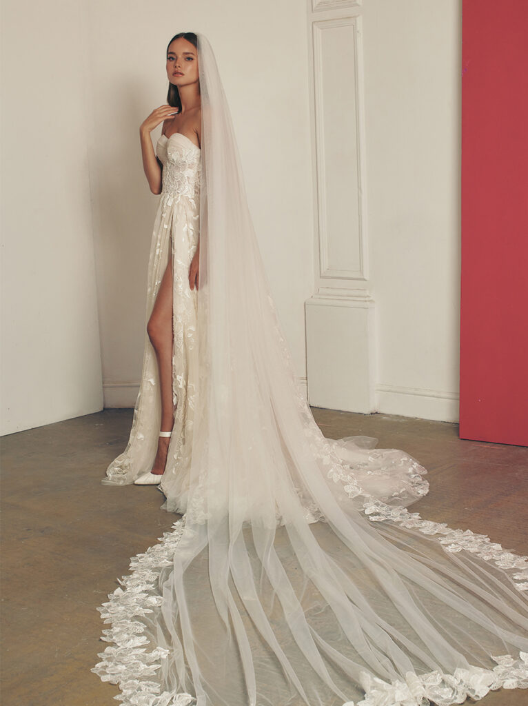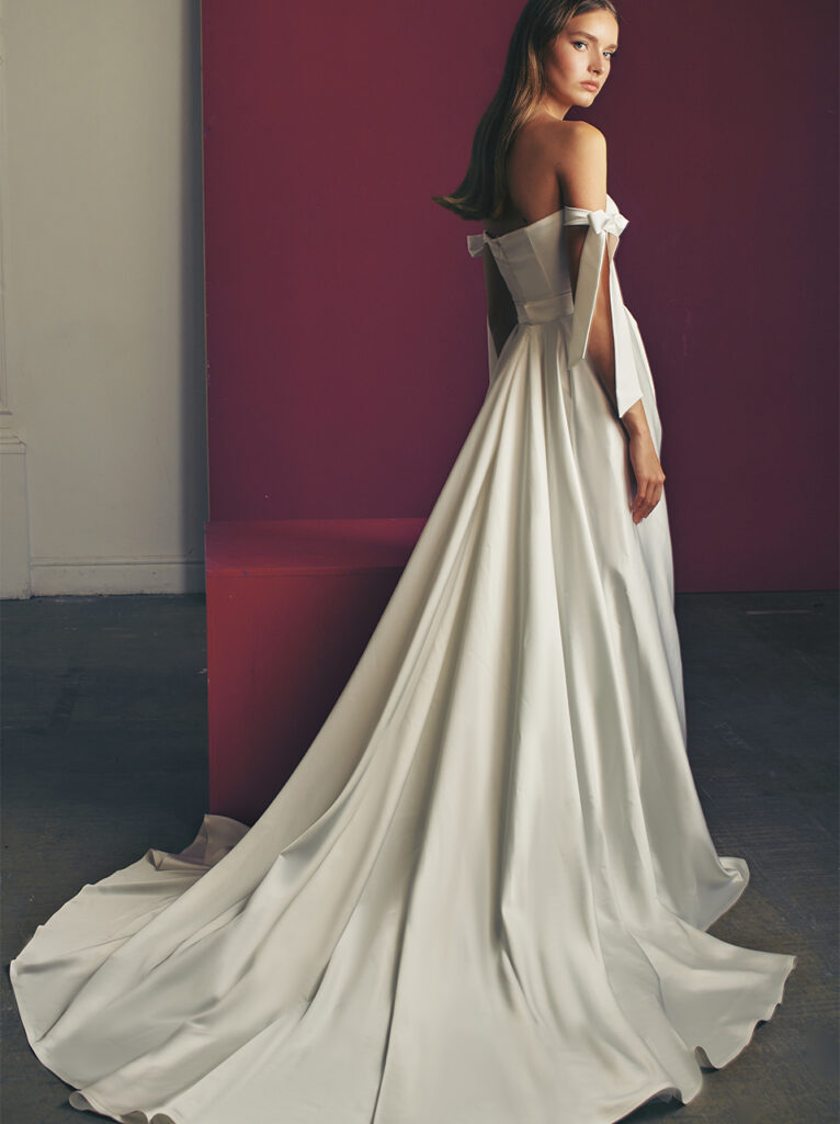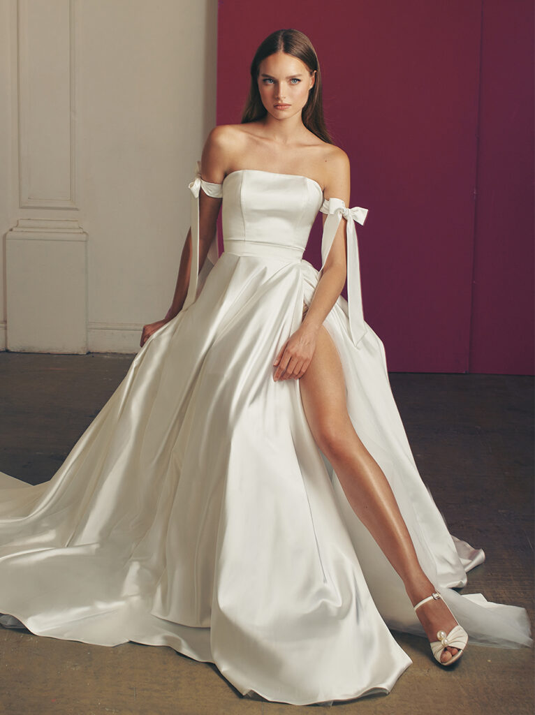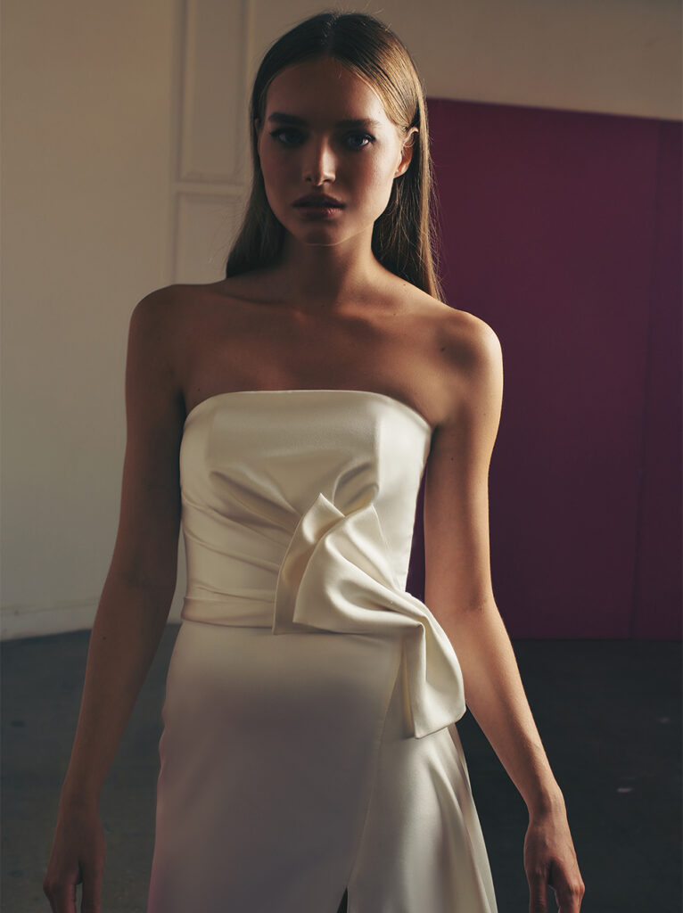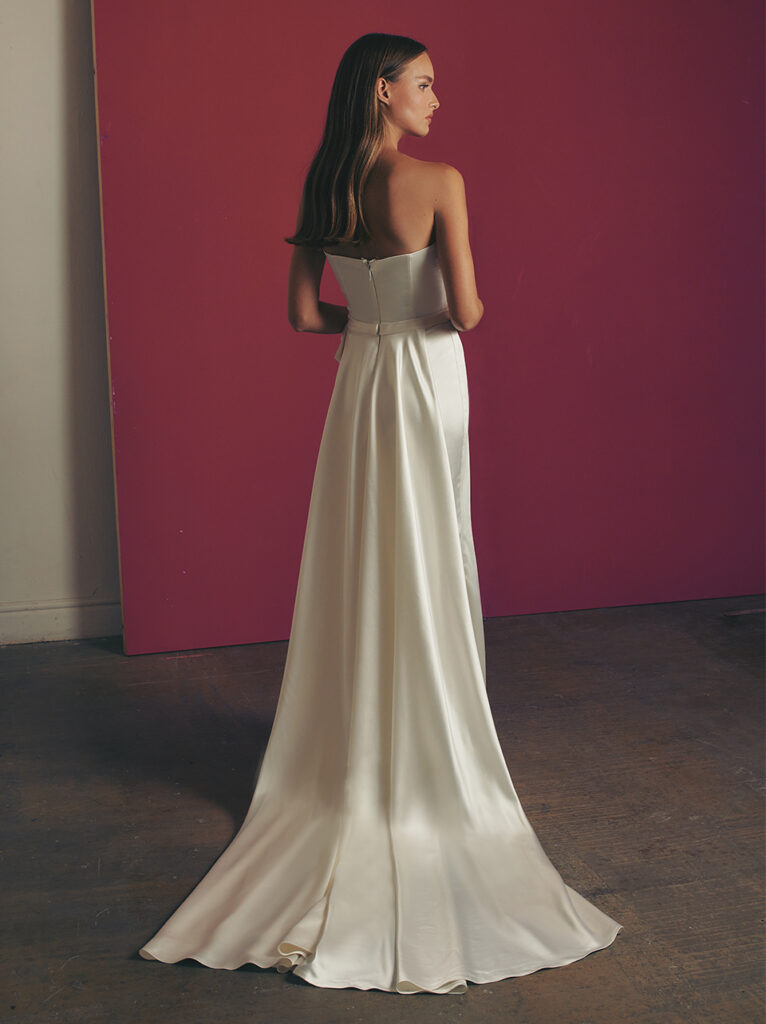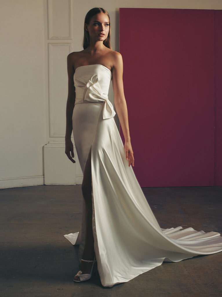 Di grande impatto anche “Viv”, abito da sposa A-line dalle linee pulite e in elegante raso, con alto spacco laterale. Per un tocco di modernità, un corpetto dritto-incrociato incornicia le spalle con nastri legati in un fiocco.