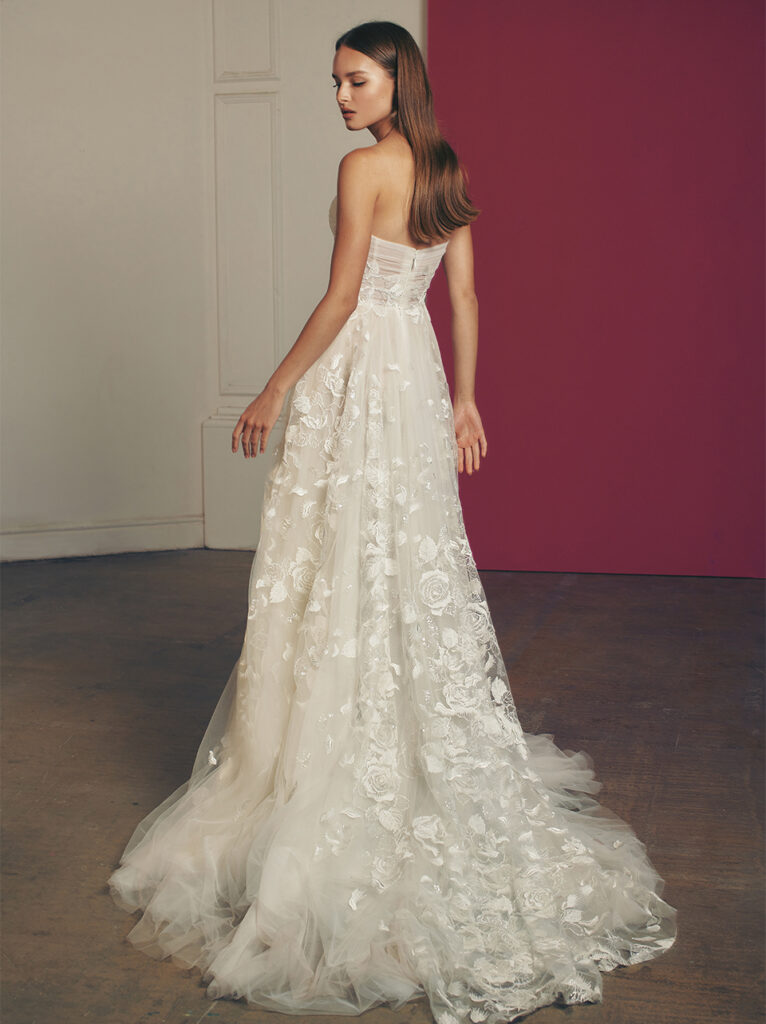 Super femminile anche l’abito da sposa A-line “Crew”, un modello ampio con corsetto, abbellito da rose 3D applicate e reso sensuale e glam grazie all’ampio spacco.