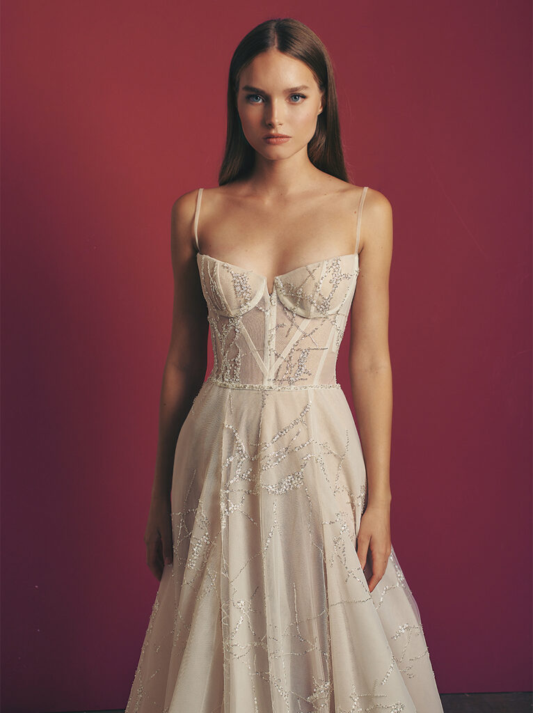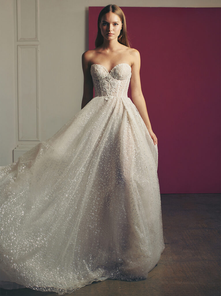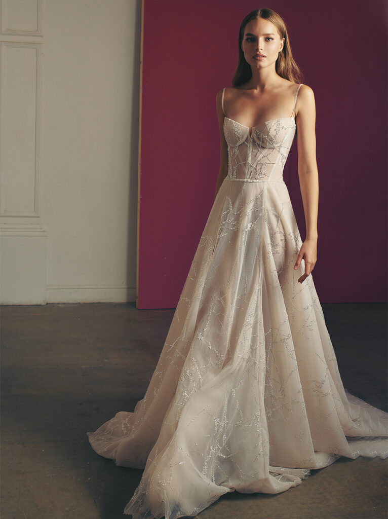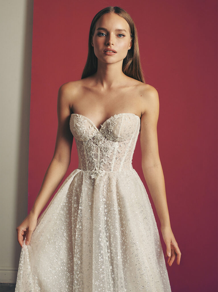 Super glam e abbelliti da ricami scintillanti sul tulle anche l’abito da sposa A-line “Glen”, dal design geometrico con ampia gonna in tulle, e il ball gown “Tyra”, in tulle glitter nei toni argento, con corsetto a cuore.