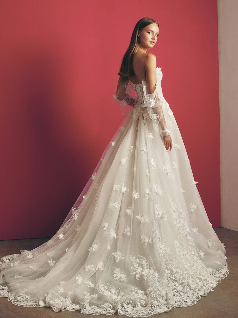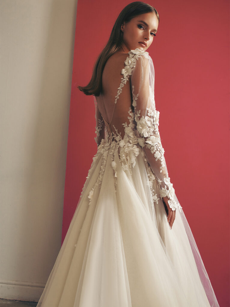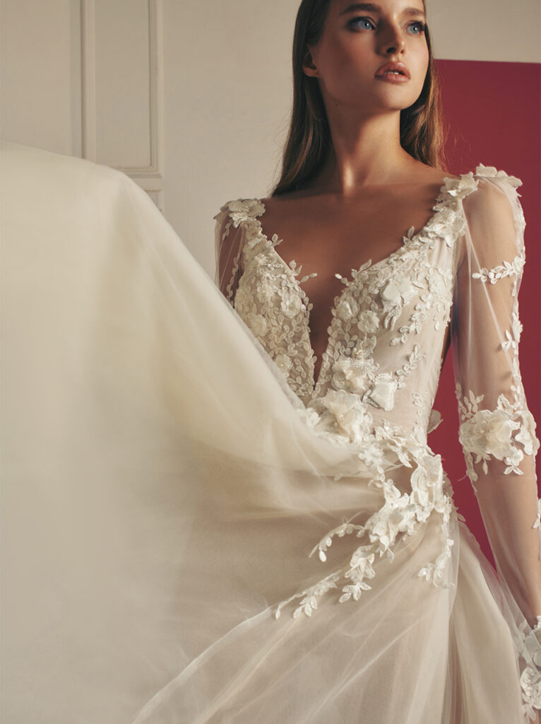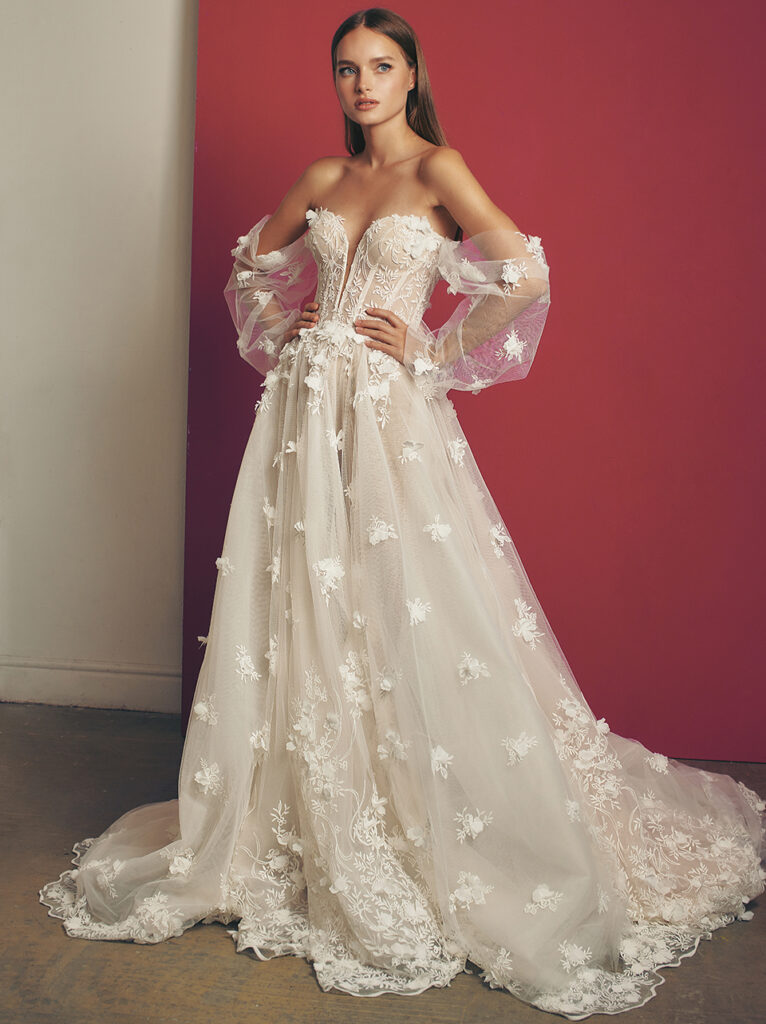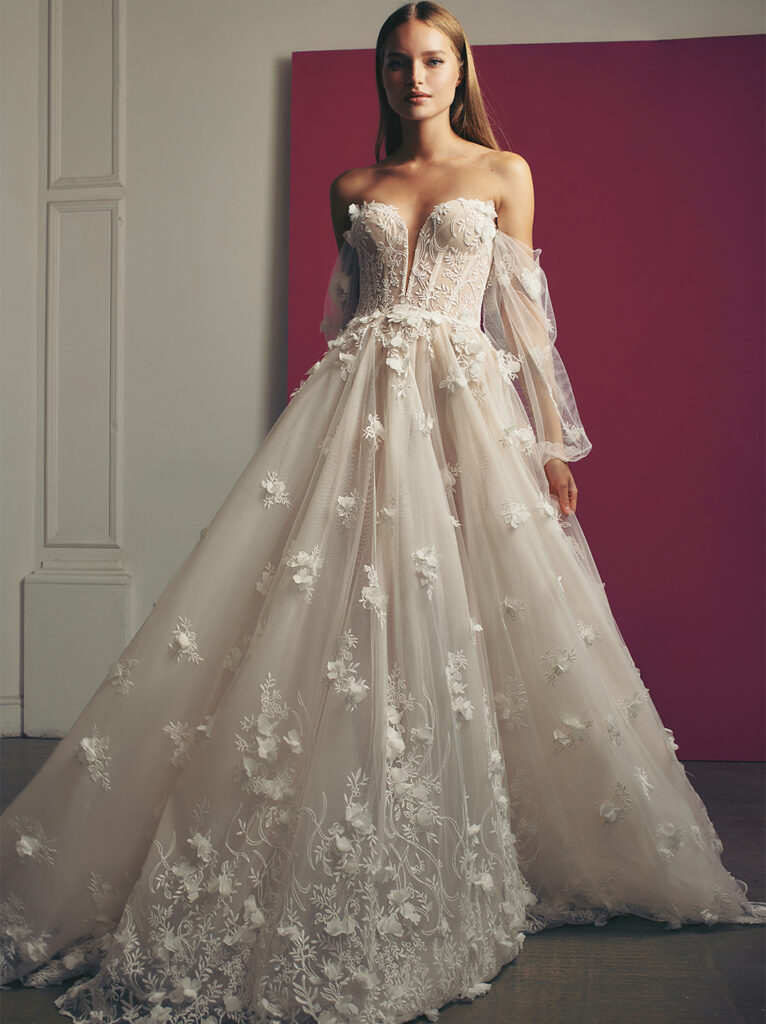 Maniche a palloncino velate e ricamate anche per “Lake”, ball gown con fiori 3D che sbocciano sul pizzo, un modello etereo ed elegante dalla scollatura a barchetta.