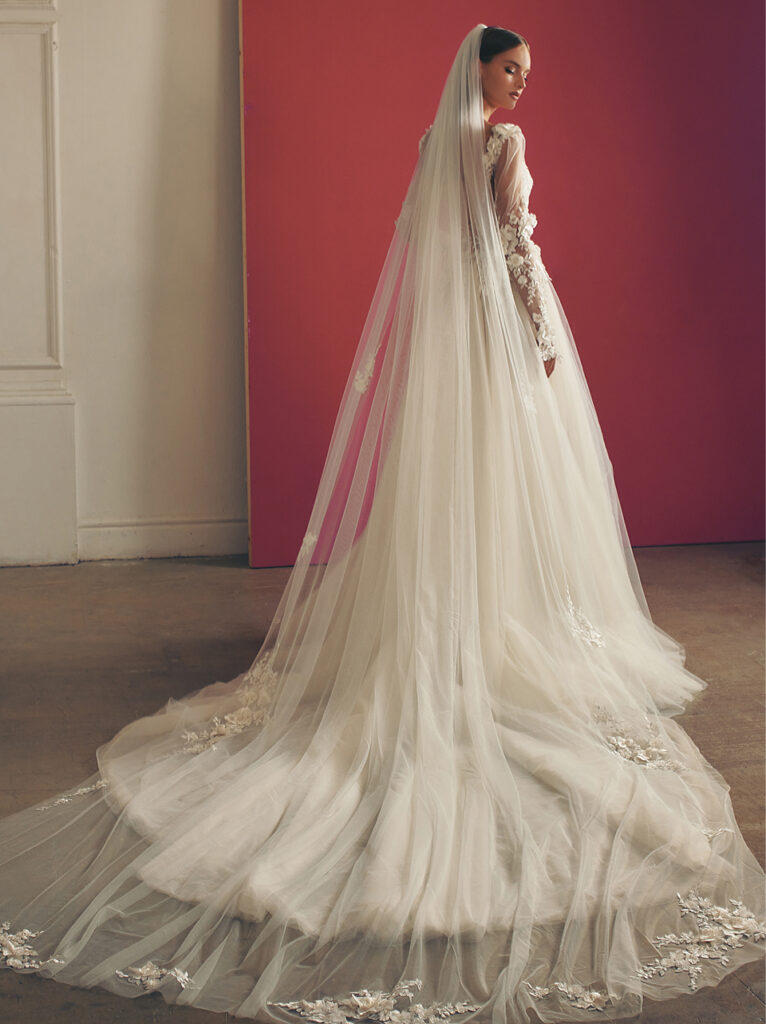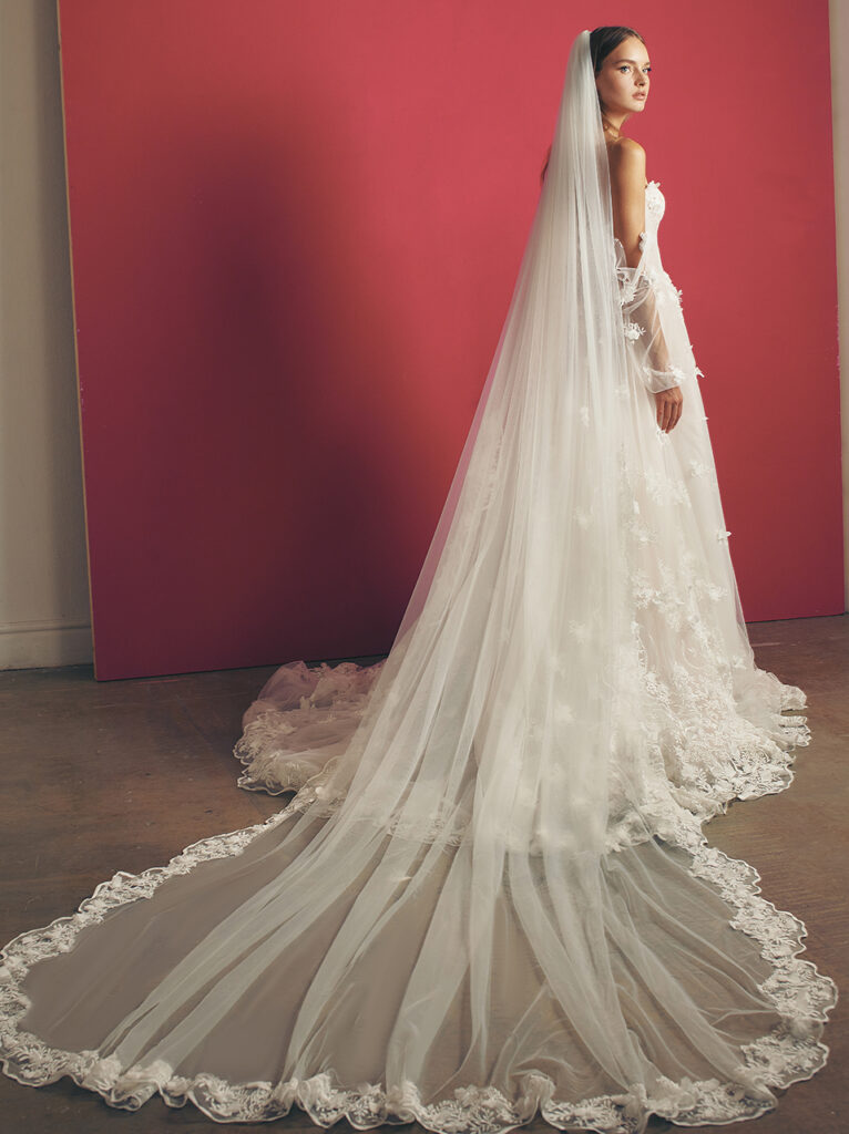 Non potevano mancare i bellissimi veli da sposa, ampi e abbelliti da ricami e inserti in pizzo, perfetto accessorio per completare il look della sposa.