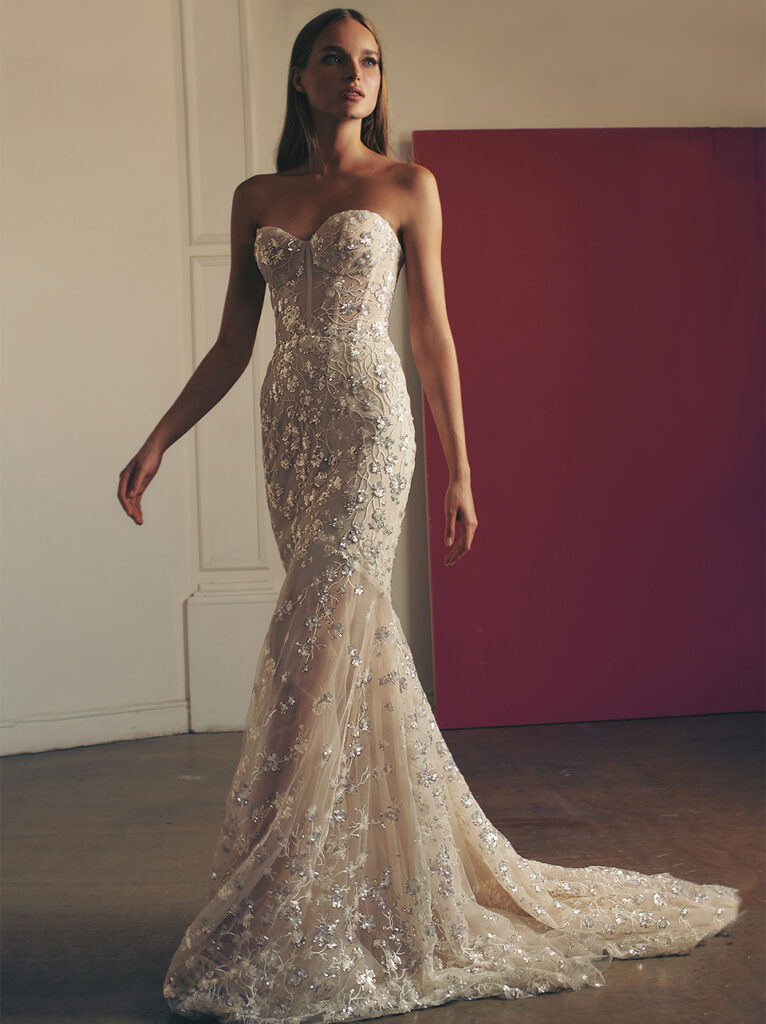 Super glam “Nelli”, abito a corsetto scolpito con paillettes argentate e trasparenti, dalla silhouette svasata che abbraccia le curve in tutti i modi giusti, mentre il pizzo con perline dà un’aria glam all'iconica scollatura a cuore e allo strascico a cappella.