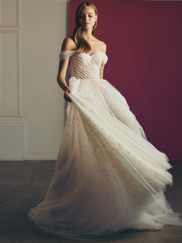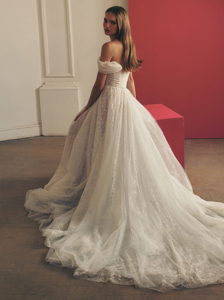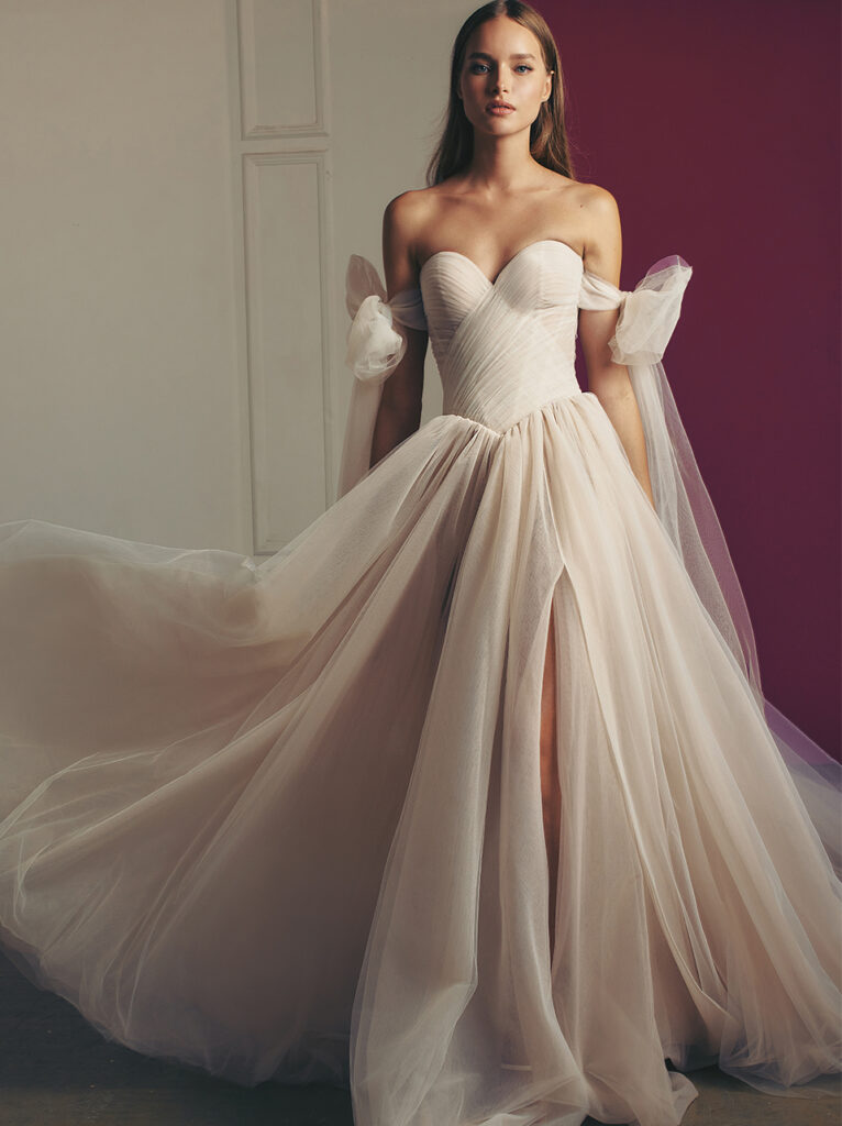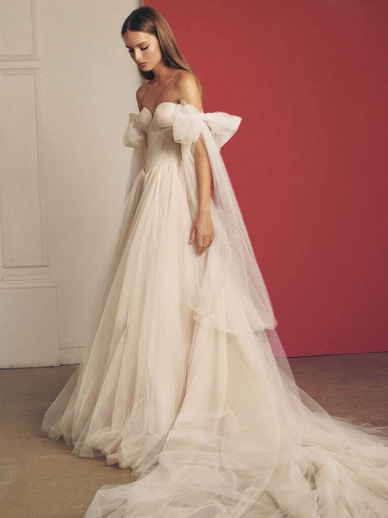 Notevole è “Richie”, un abito da sposa regale in tulle di seta arricchito da un corsetto a punta strutturato e drappeggiato, ammorbidito dalla scollatura off-the-shoulder rifinita con fiocchi chic e uno spacco laterale contemporaneo; un ball gown davvero notevole con strascico a cattedrale.