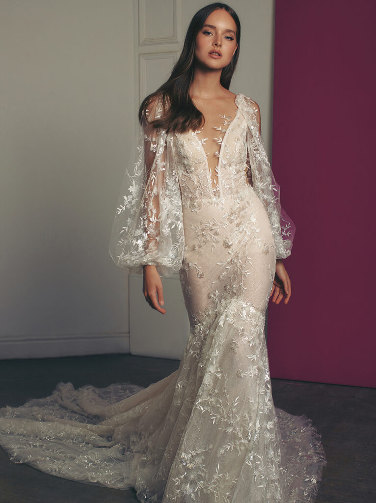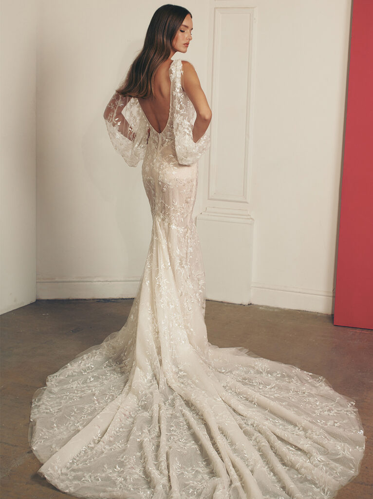 Davvero spettacolare “Cali”, abito da sposa a sirena nei toni cipria e avorio, con scollatura a cuore, schiena a corsetto trasparente e un ricamo organico su un tulle speciale abbinato a un bolero ricamato con maniche lunghe velate.