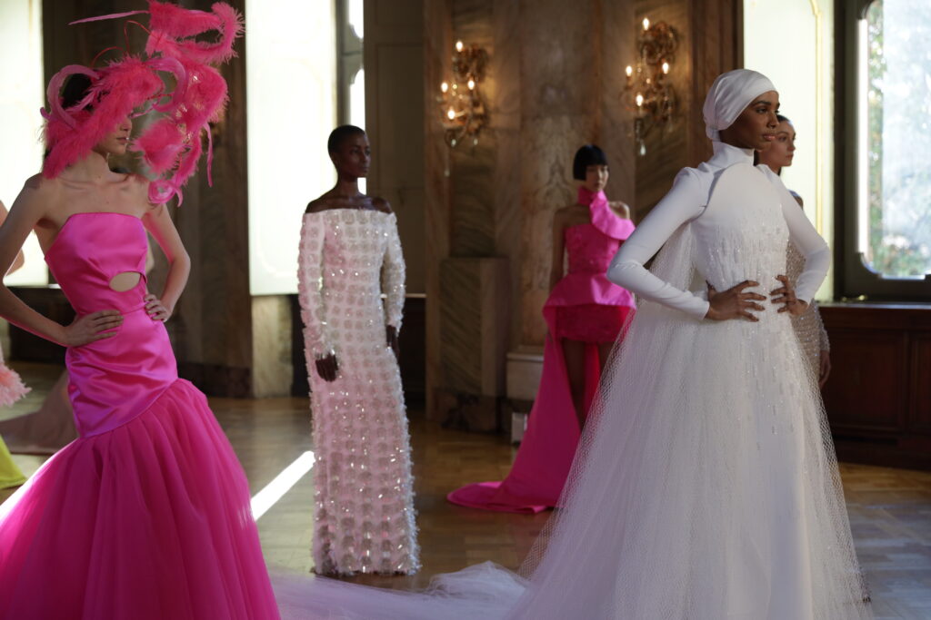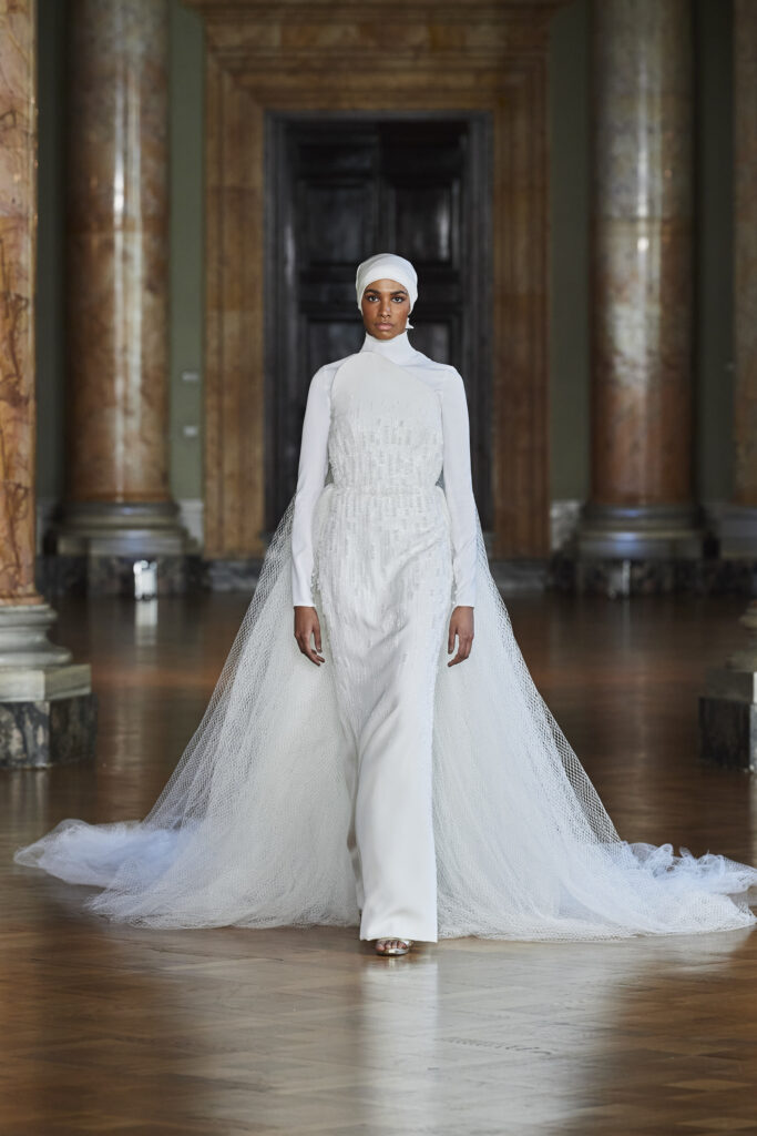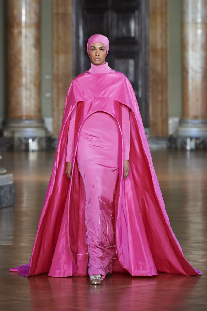 Vediamo infatti la modella aprire la sfilata in un voluminoso abito color bubblegum e hijab in tinta e la vedremo poi chiuderla in abito da sposa, con un hijab di colore bianco.