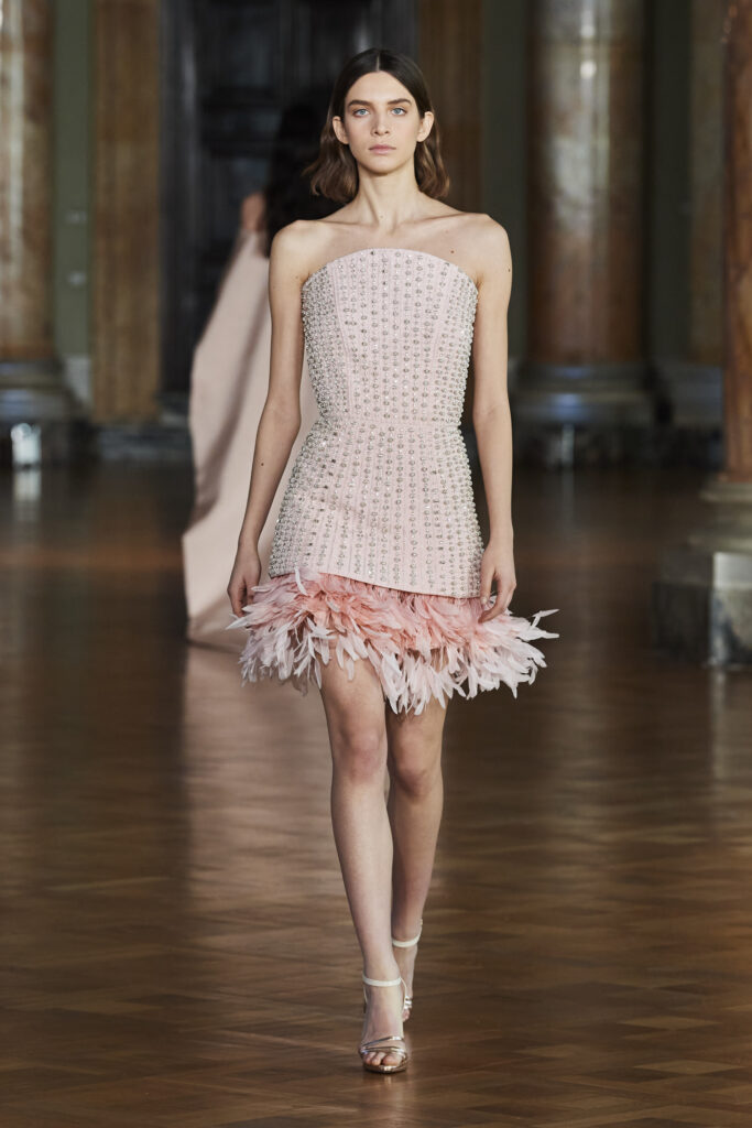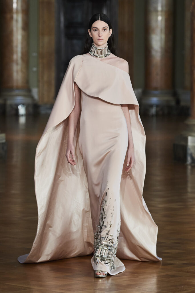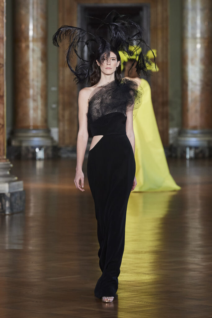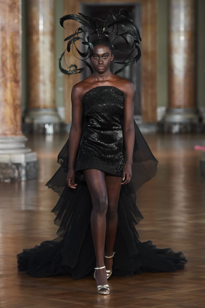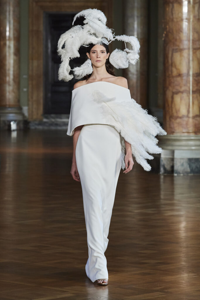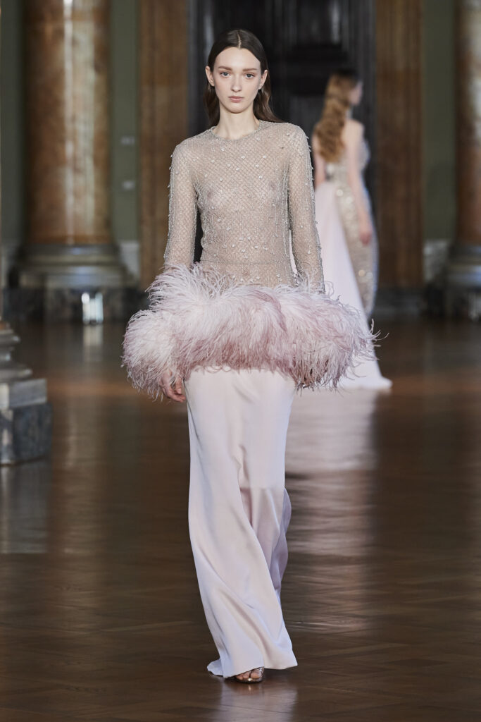 Il tutto, abbellito da ricami all over in 3D, geometrici, metallici e cristallini “che bagnano gli orli come rugiada nei fiori” e da piume, che “spuntano dagli orli, come boa che avvolgono i fianchi, sulle cappe e su scenografici copricapi”.