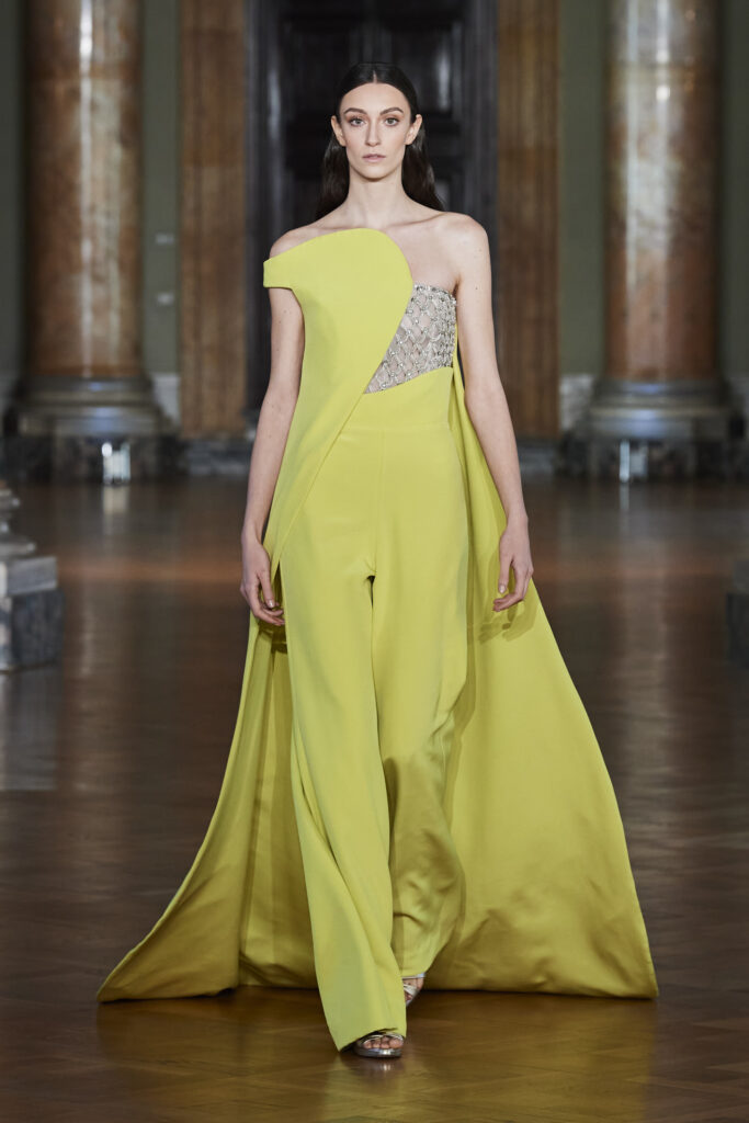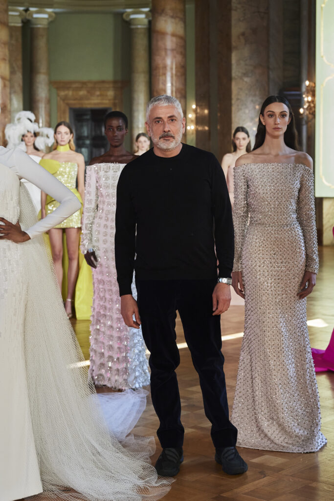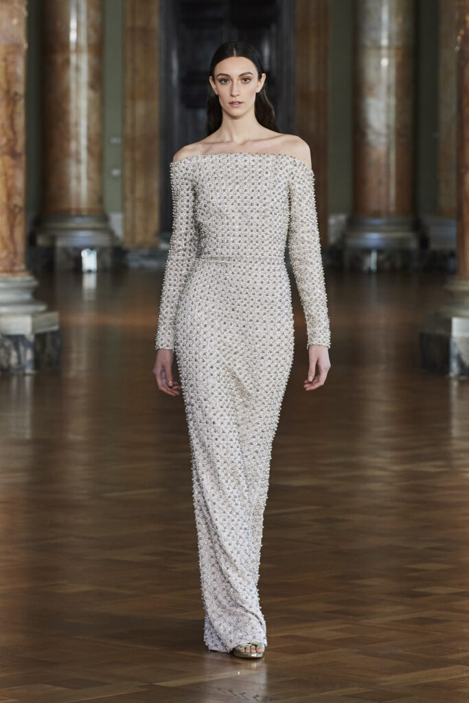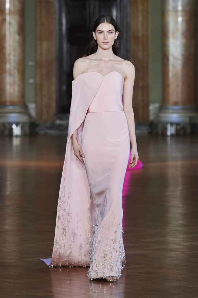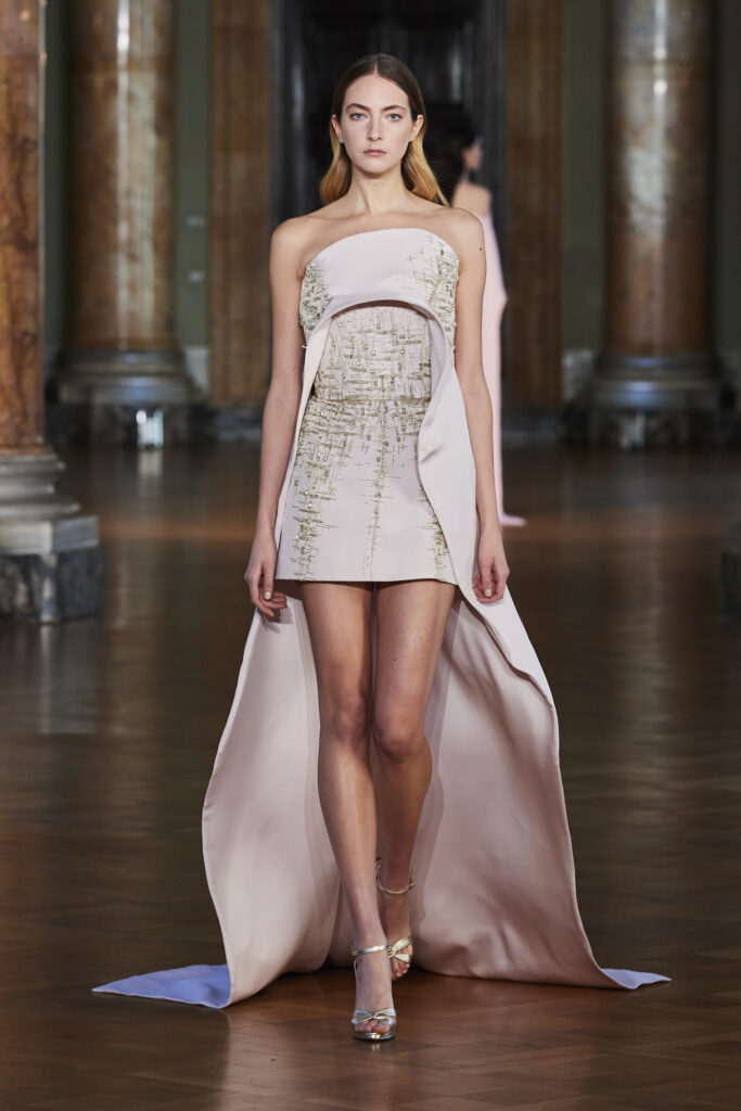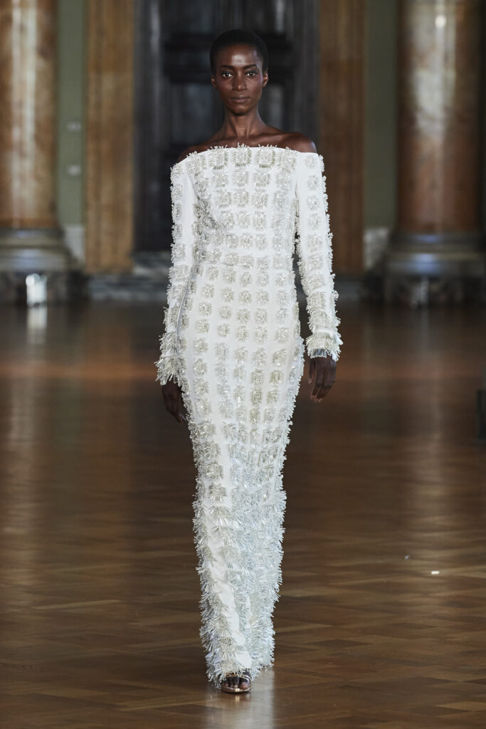 Il tutto, abbellito da ricami all over in 3D, geometrici, metallici e cristallini “che bagnano gli orli come rugiada nei fiori” e da piume, che “spuntano dagli orli, come boa che avvolgono i fianchi, sulle cappe e su scenografici copricapi”.