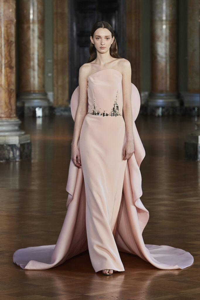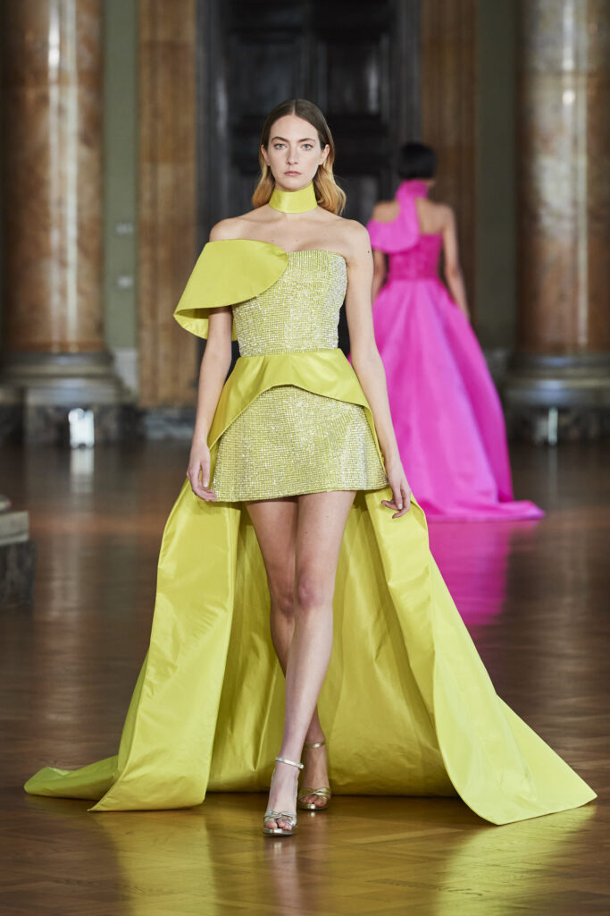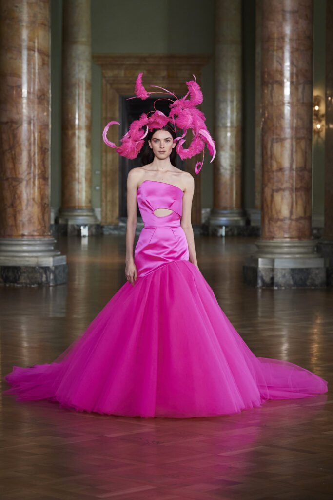 “Lo studio e la ricerca delle forme – spiega il brand - continuano verso volumi scultorei e vistosi con esplosioni e sovrapposizioni di tessuto che ricordano i petali dei fiori come le grosse maniche di taffetà che diventano mantelli; giochi di tulle, anche plissè, e di velette che vanno a formare lunghe code che partono dalle scollature”.