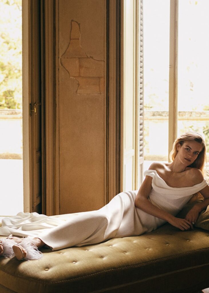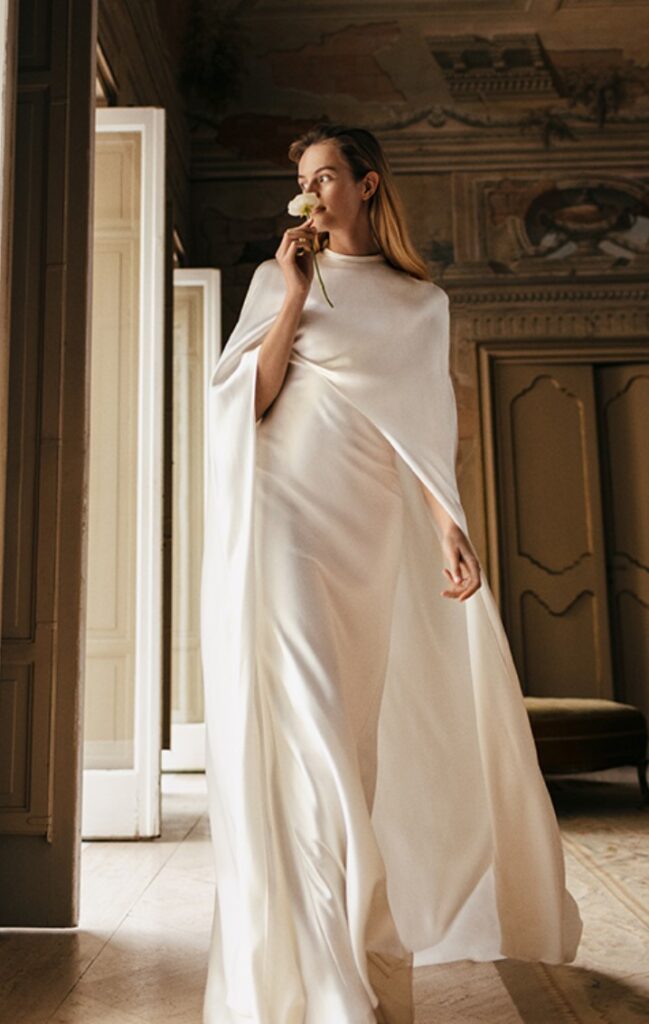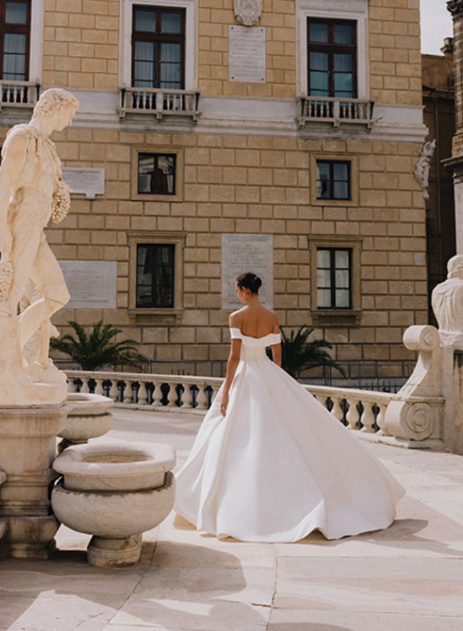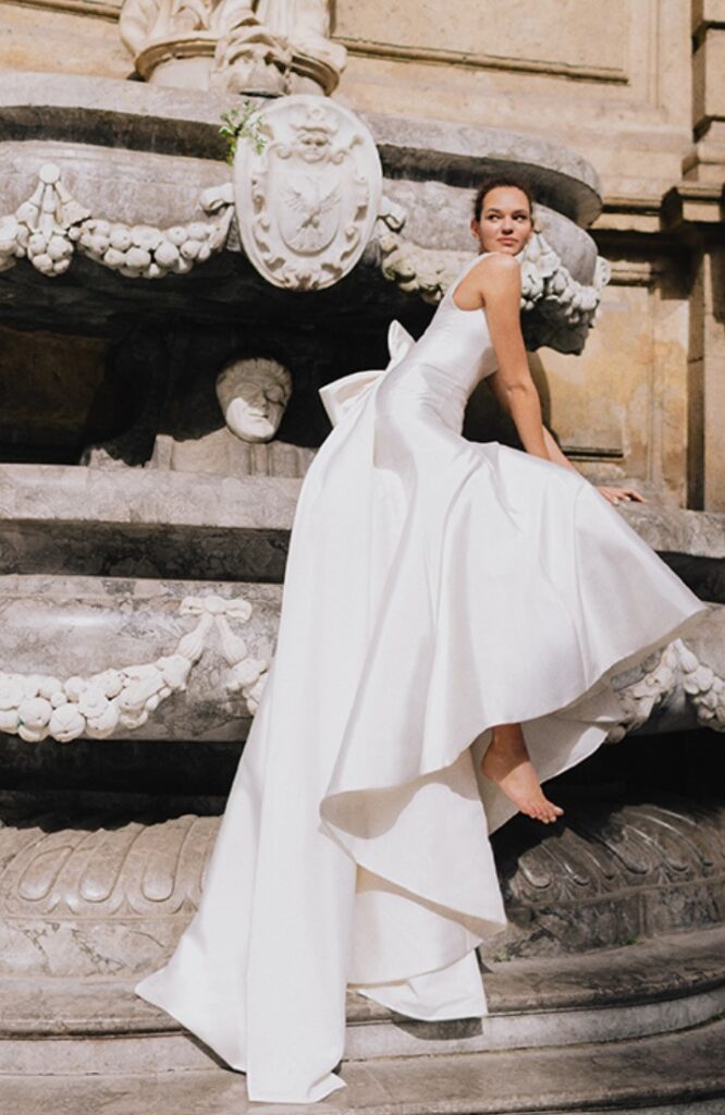 Scarpe da sposa messe in evidenza anche negli abiti da sposa corti: “Gaia”, un abito di lana, sormontato da un velo colorato ricamato al gomito, che, come spiega il brand, “evoca una moderna Apollonia” e “Marisa”, un abito in mikado con un bellissimo intreccio sulla scollatura, che vediamo anche nell’abito da sposa A-line “Luisa”.