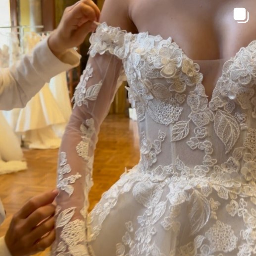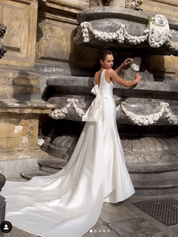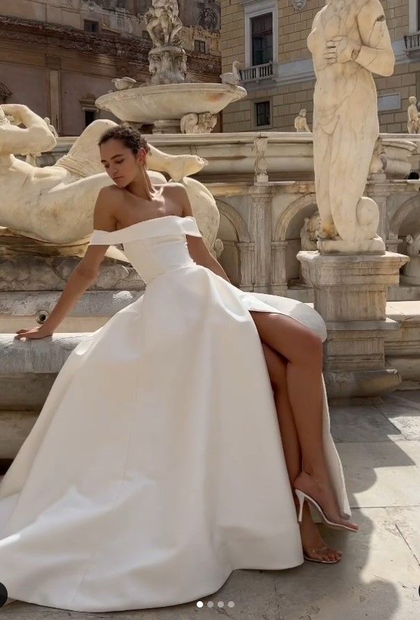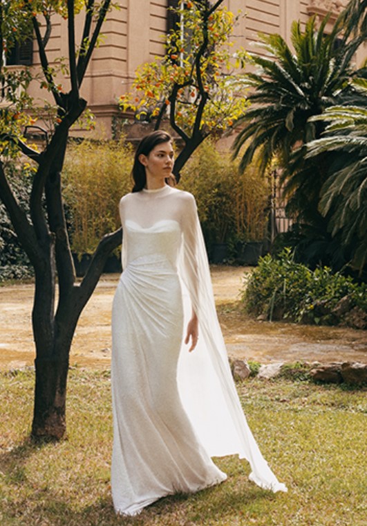 Glamour e colore anche negli abiti da sposa con fini ricami floreali: l’abito da sposa corto a tubino "Sicily", con abbinato strascico Watteau e l’abito da sposa in tulle "Liliana", un modello A-line con ampio scollo e rouche.