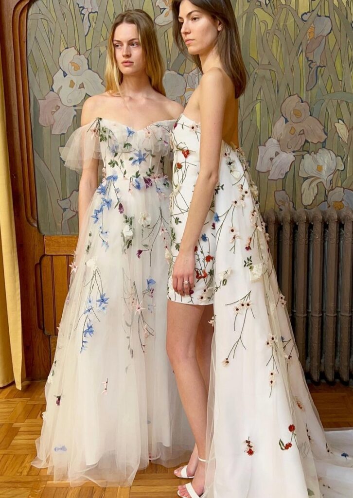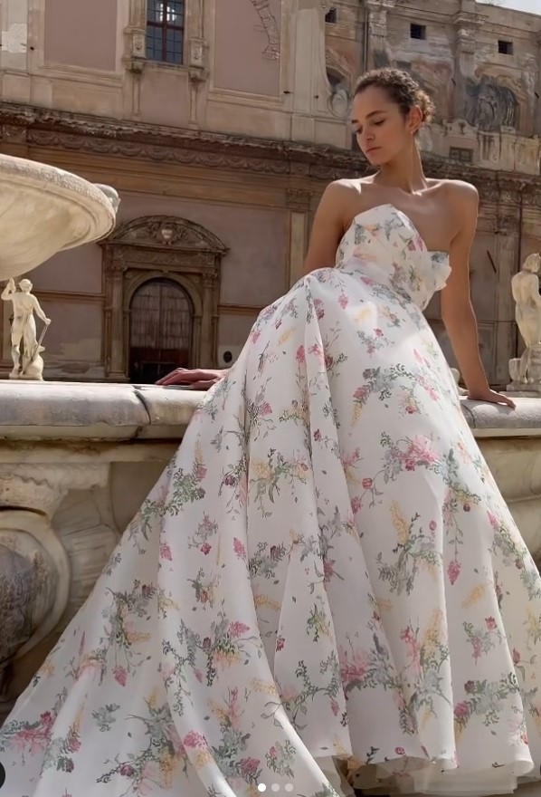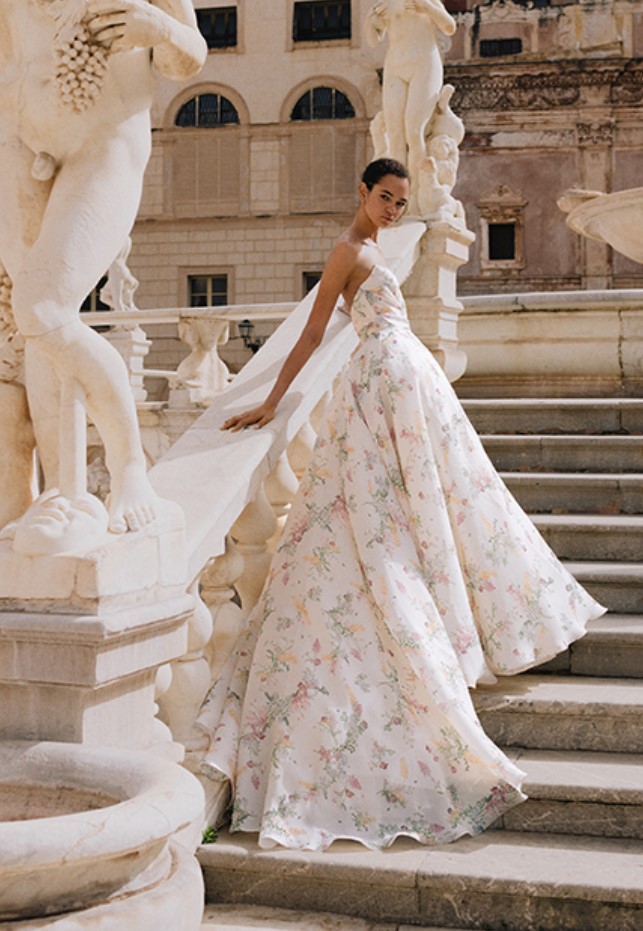 Guardando gli abiti da sposa in organza a stampa floreale colorati, notiamo l’abito da sposa da principessa “Positano”, un modello già visto nelle precedenti collezioni, con un delizioso scollo a cuore drappeggiato che prosegue sul retro ed ampio strascico e l’abito da sposa “Bellini”.