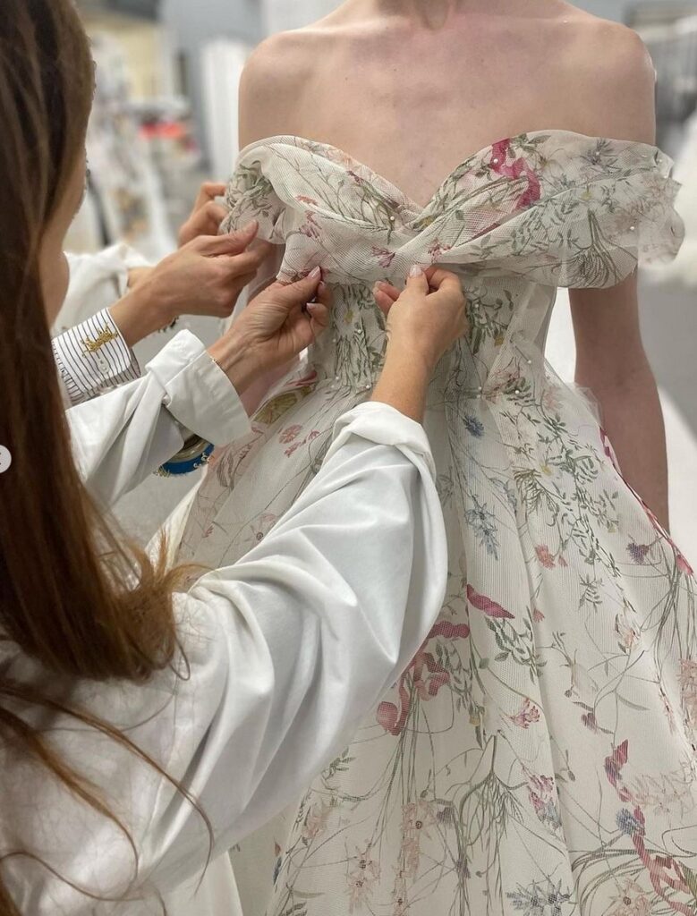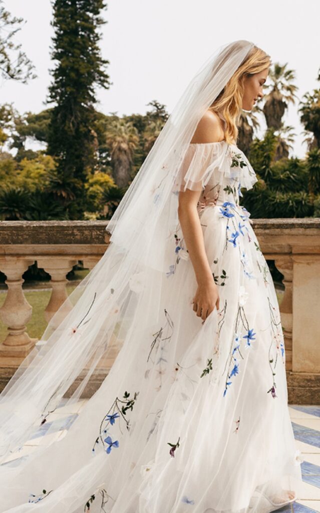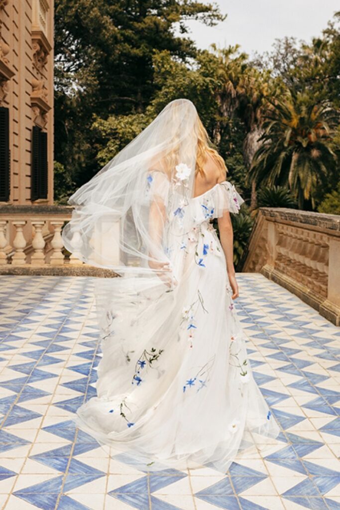 Abiti da sposa in organza a stampa floreale anche nella collezione sposa Spring 2023 Bliss, la linea sposa a prezzi accessibili proposta dal 2015 dalla stilista.