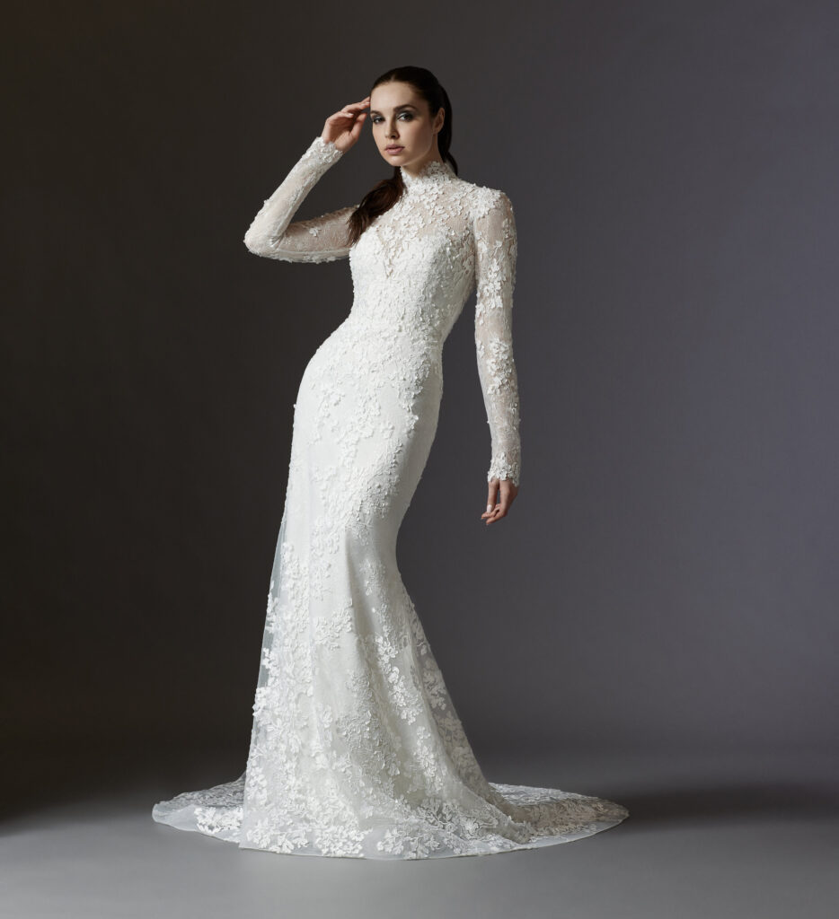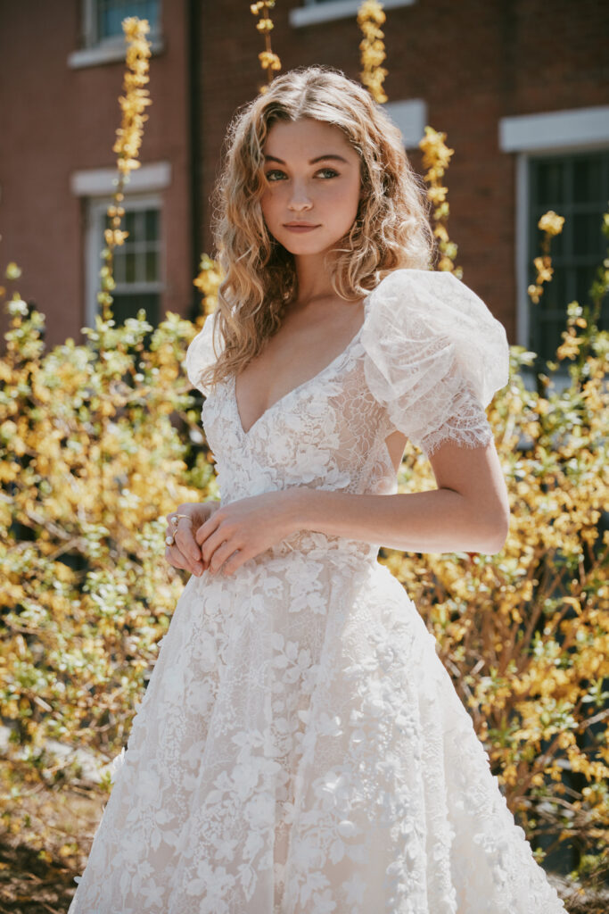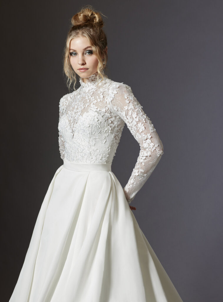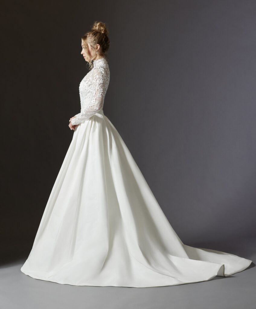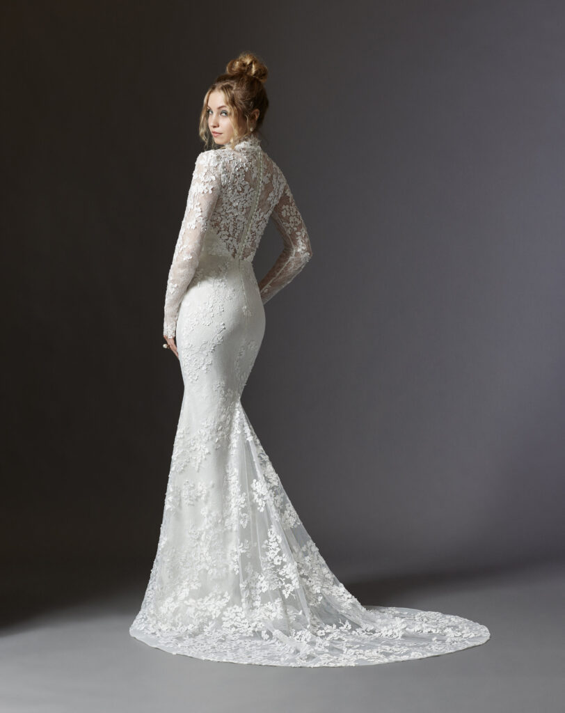 In apertura di collezione, l’abito da sposa “Austen”, un modello svasato in pizzo ricamato con applicazioni di petali, corpetto con scollo alto e maniche lunghe, mentre sul retro fanno bella mostra di sé deliziosi bottoni ricoperti. L’abito ha il suo velo cattedrale con petali ricamati, bordo grezzo, fiocco su misura.