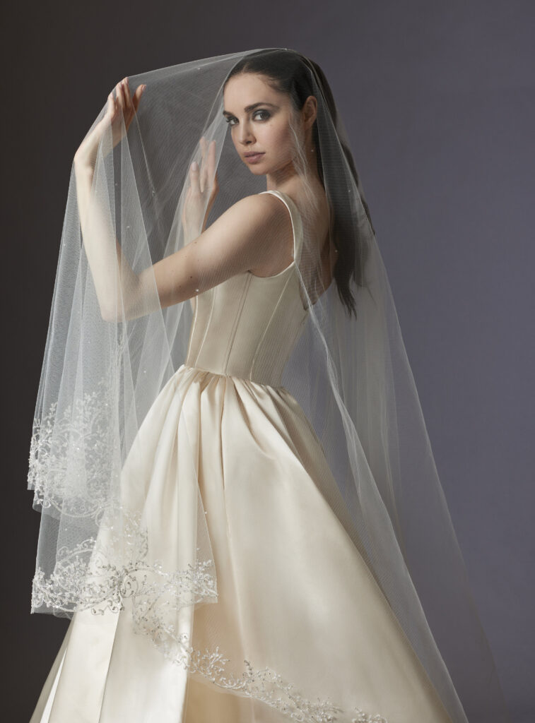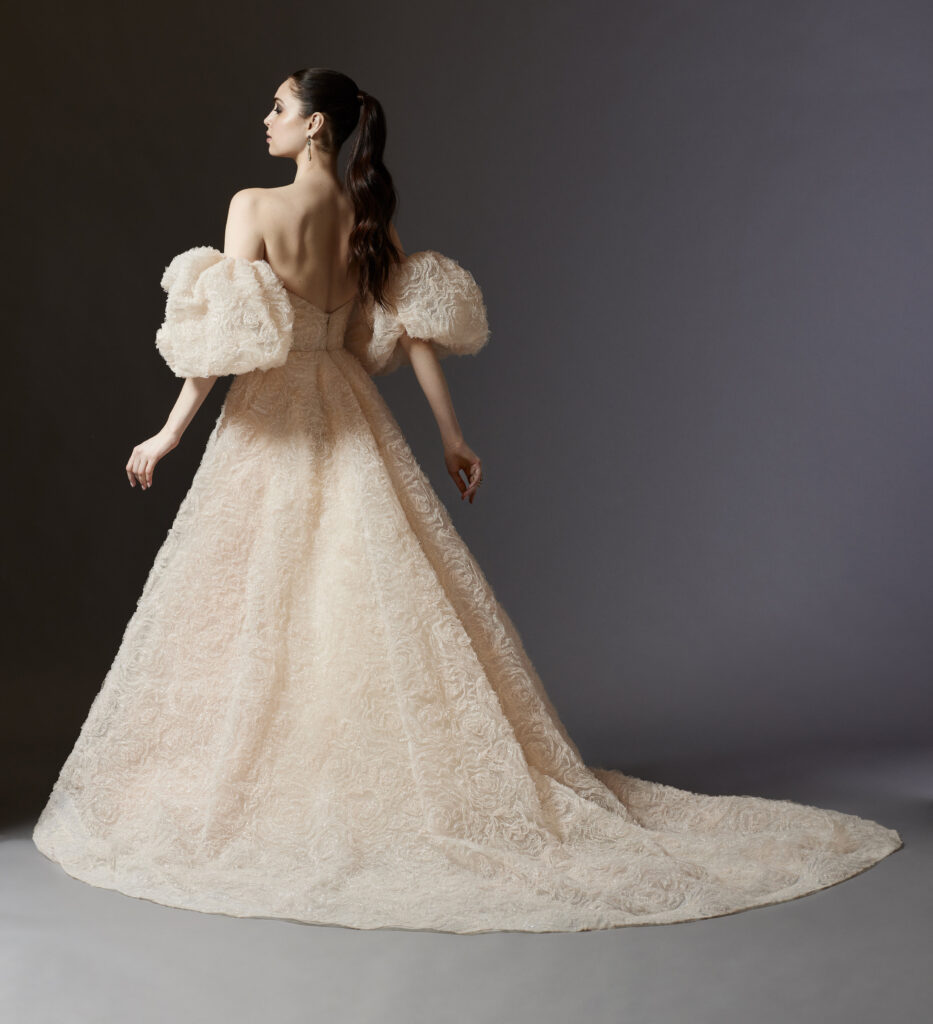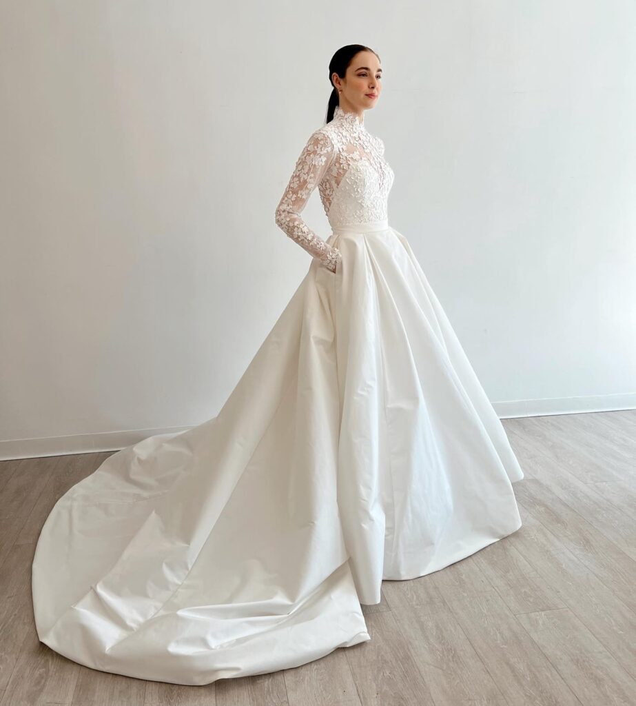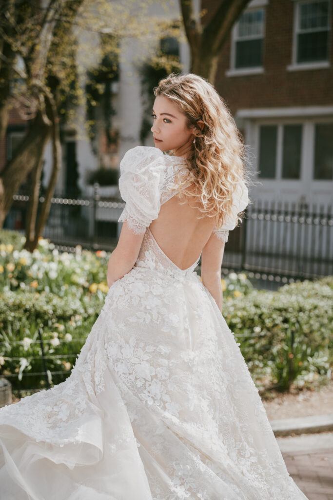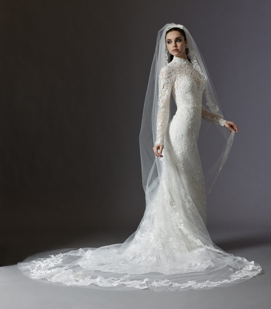 In apertura di collezione, l’abito da sposa “Austen”, un modello svasato in pizzo ricamato con applicazioni di petali, corpetto con scollo alto e maniche lunghe, mentre sul retro fanno bella mostra di sé deliziosi bottoni ricoperti. L’abito ha il suo velo cattedrale con petali ricamati, bordo grezzo, fiocco su misura.