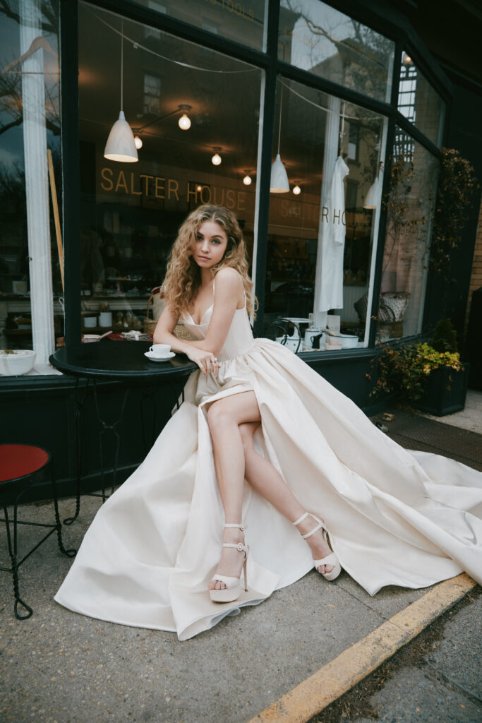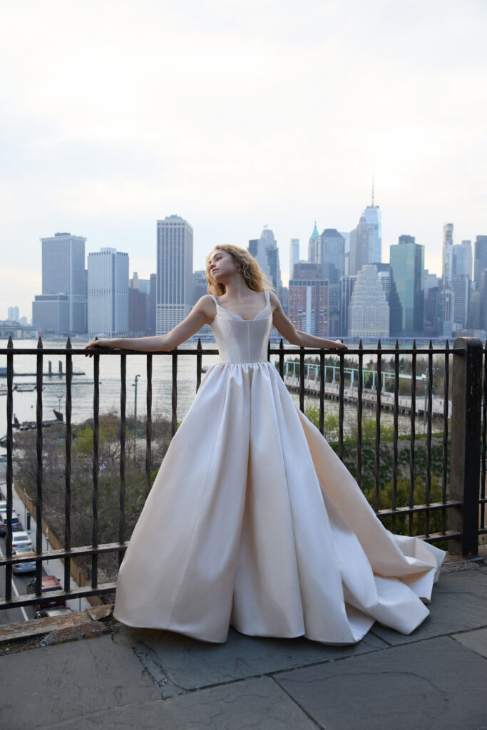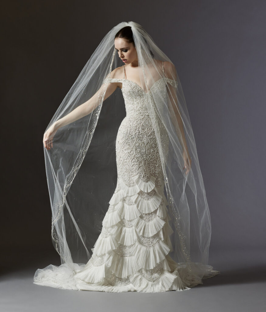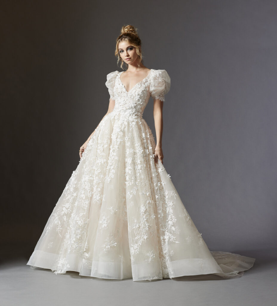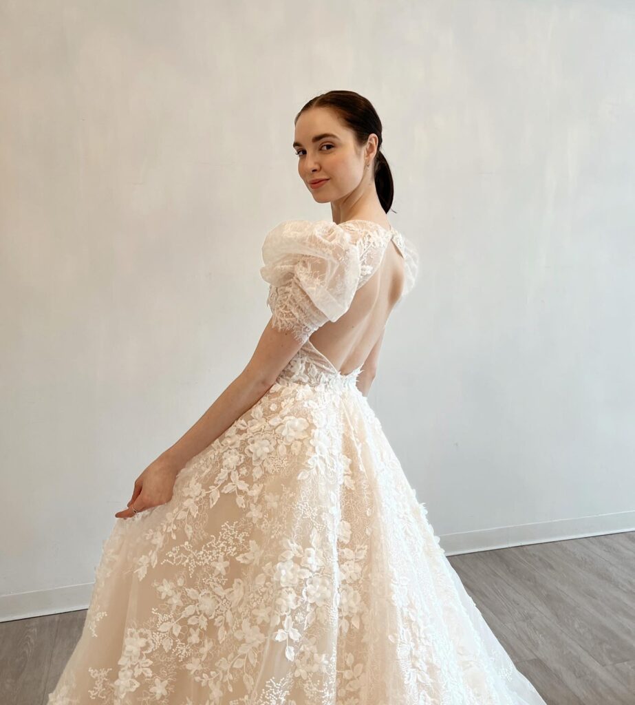 In apertura di collezione, l’abito da sposa “Austen”, un modello svasato in pizzo ricamato con applicazioni di petali, corpetto con scollo alto e maniche lunghe, mentre sul retro fanno bella mostra di sé deliziosi bottoni ricoperti. L’abito ha il suo velo cattedrale con petali ricamati, bordo grezzo, fiocco su misura.