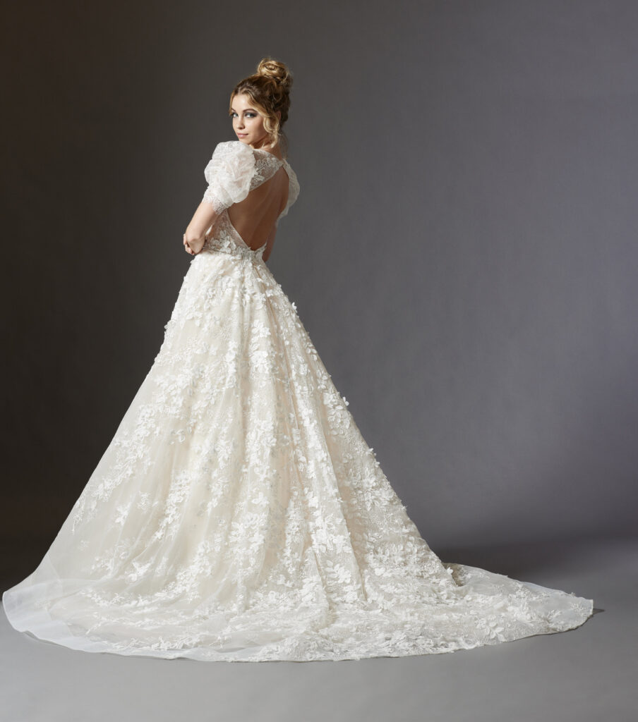 Focus sulla schiena per il delizioso abito da ballo “Genevieve”, un modello ricamato con fiori e petali, scollatura a V con apertura sulla schiena, maniche corte arricciate, vita naturale, gonna circolare con finiture in crine, strascico a cappella.
