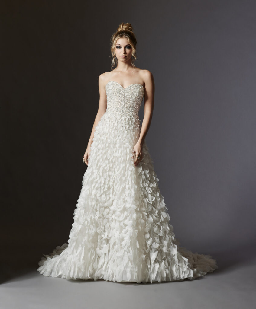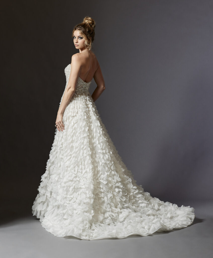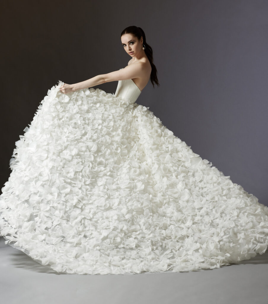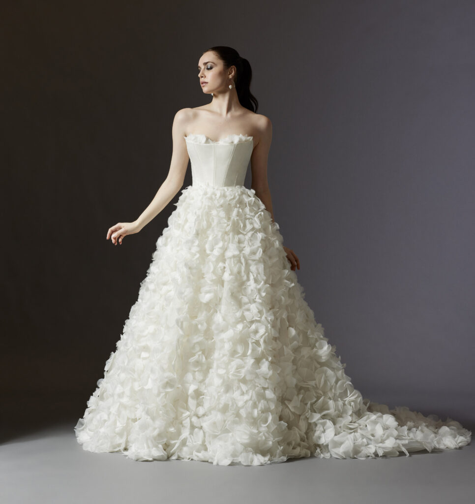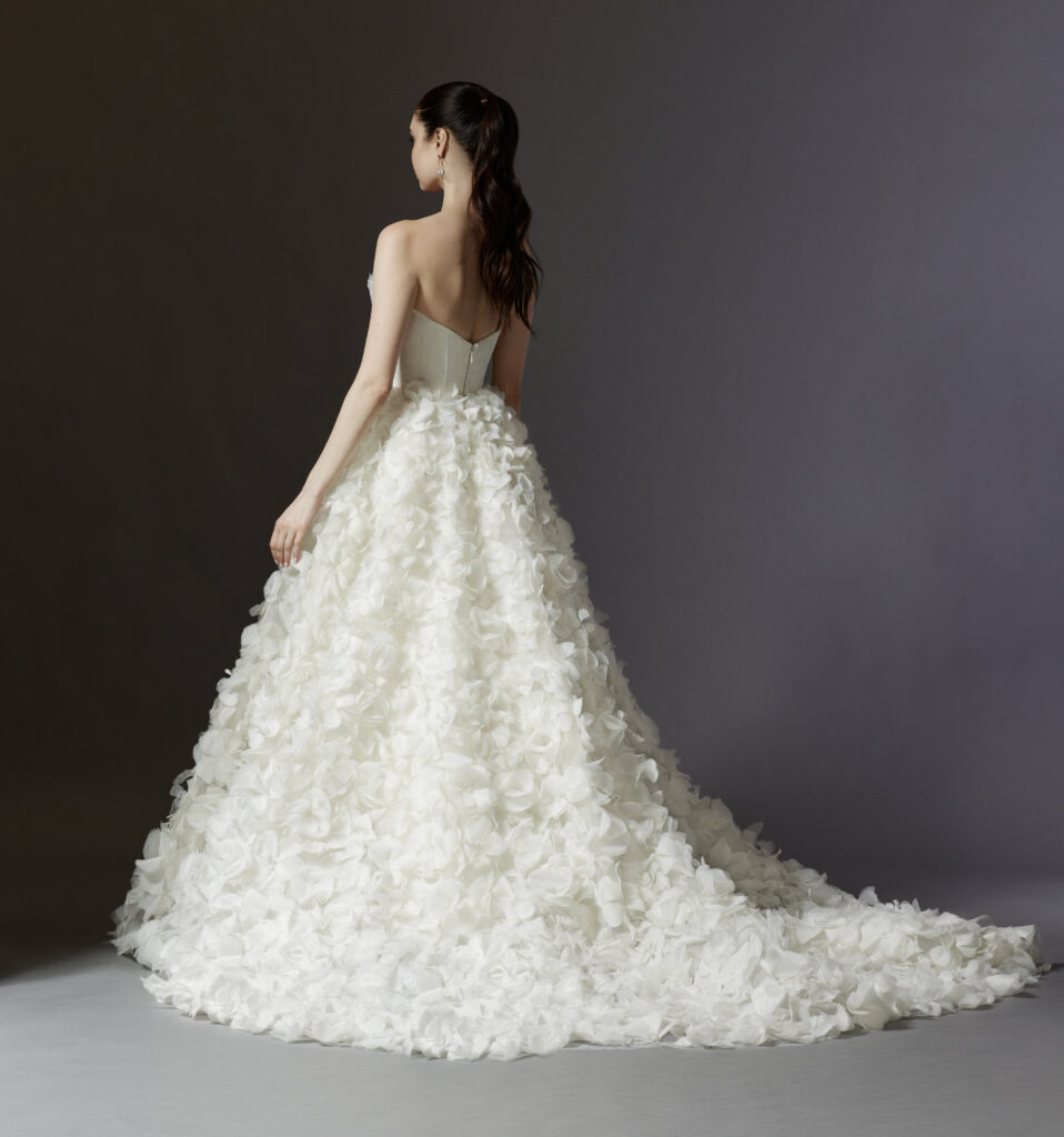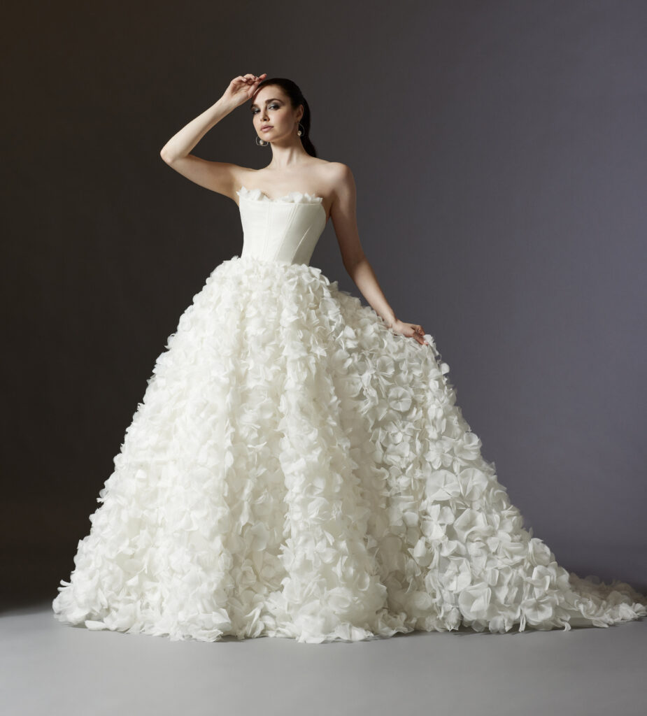 Gran chiusura con “Marcelle”, abito da ballo con texture a petali, scollatura a cuore senza spalline con corpetto floreale a corsetto francese, vita naturale, gonna in organza con texture a petali floreali e accenti di cristallo; strascico a cappella.