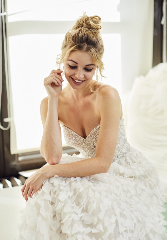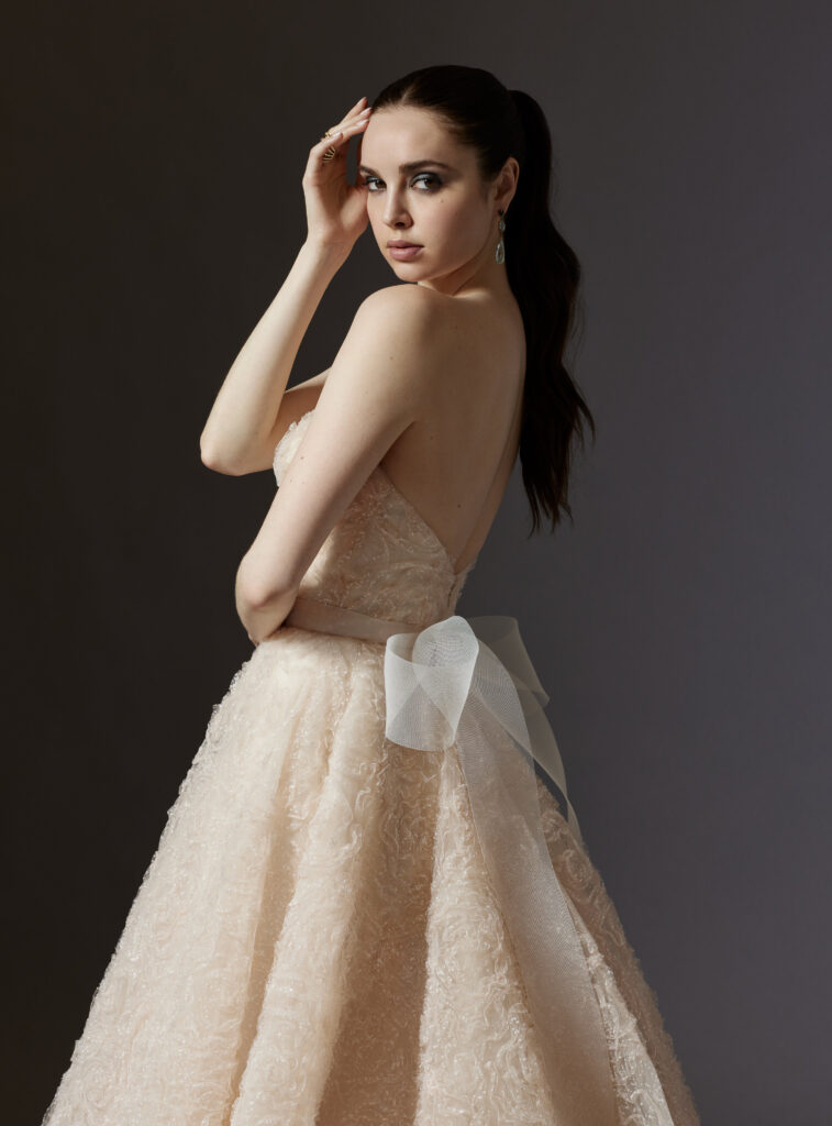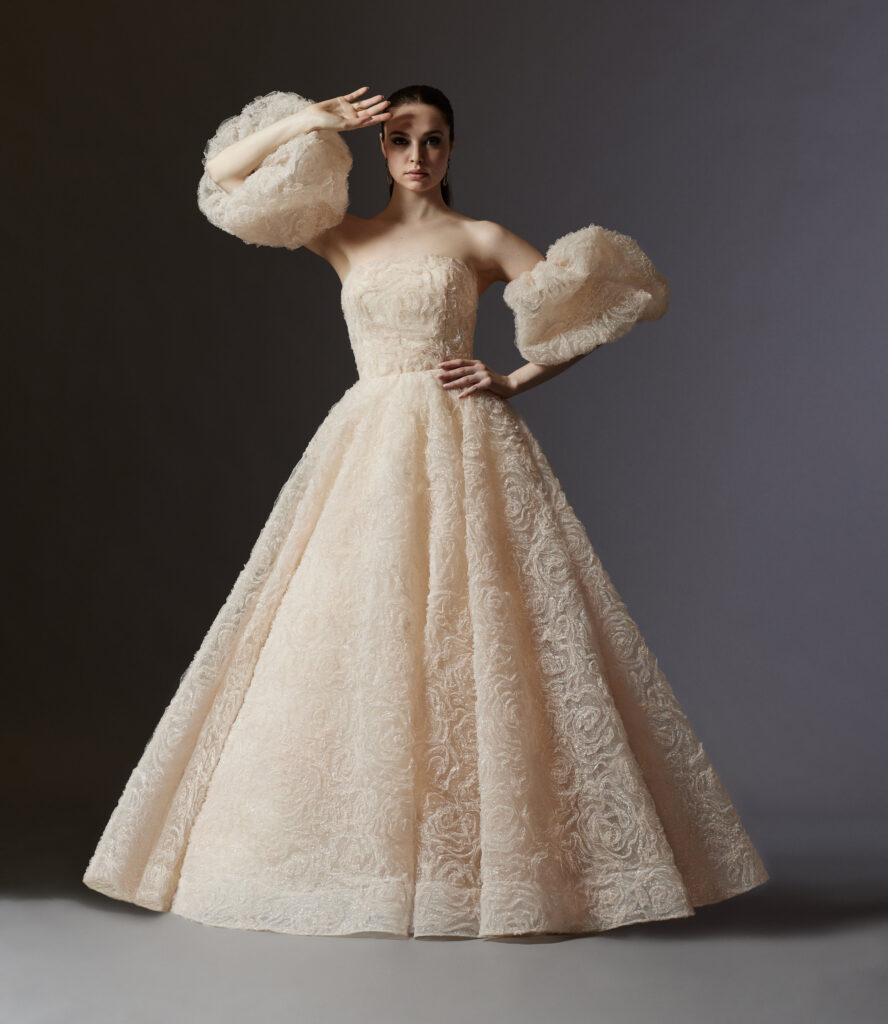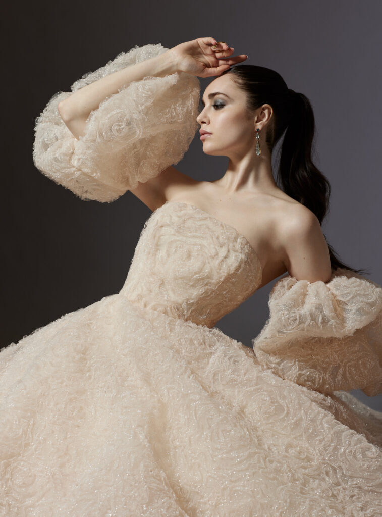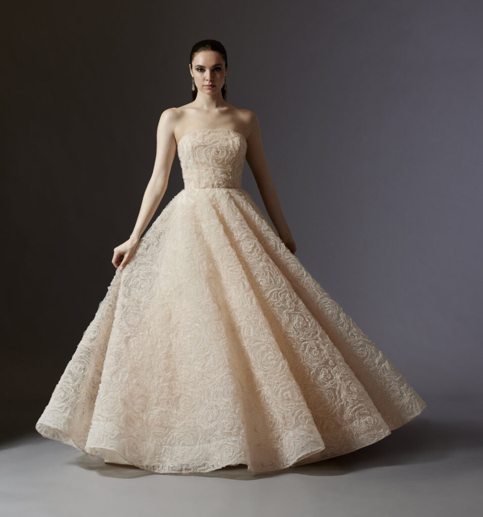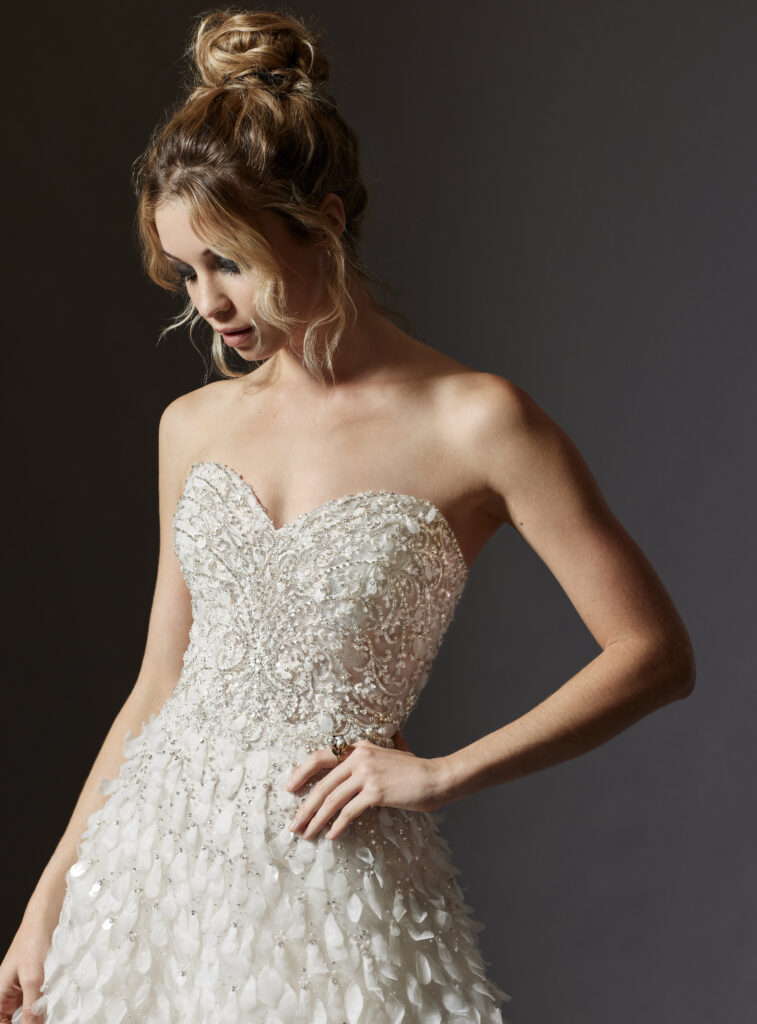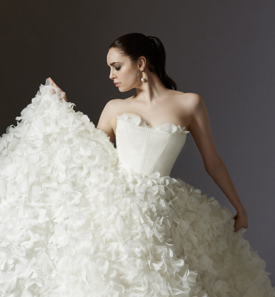 Gran chiusura con “Marcelle”, abito da ballo con texture a petali, scollatura a cuore senza spalline con corpetto floreale a corsetto francese, vita naturale, gonna in organza con texture a petali floreali e accenti di cristallo; strascico a cappella.
