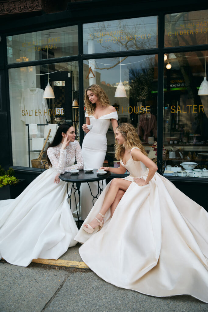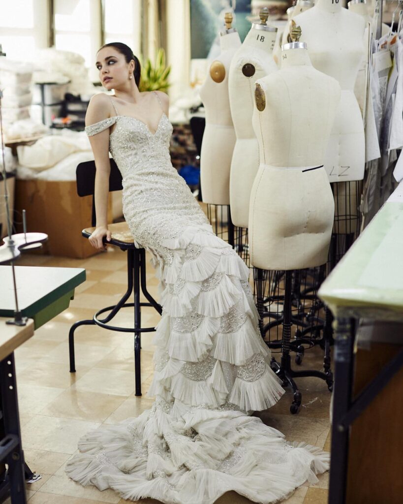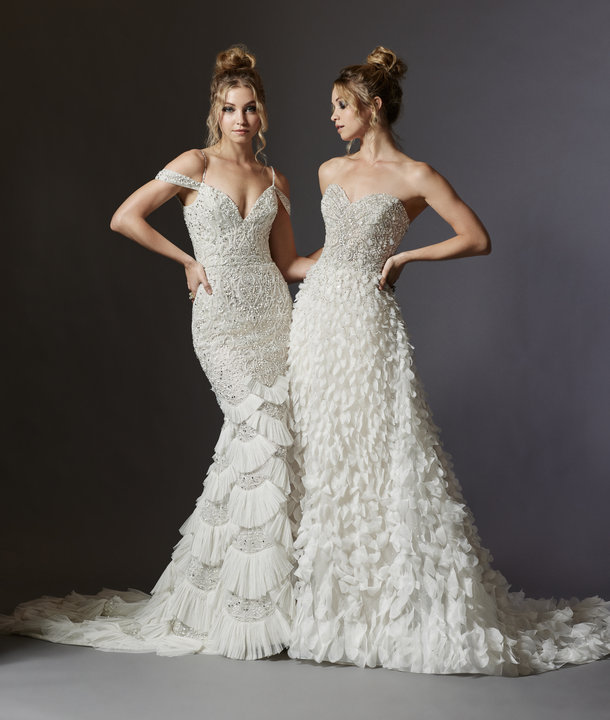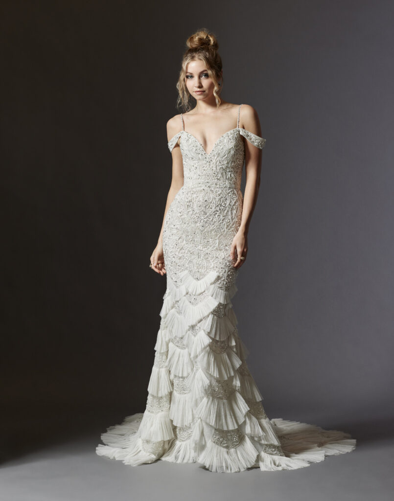 Nella collezione sposa, l’abito Venus – come visto ad inizio articolo - viene presentato accanto al modello “Jocelyn”, un abito da sposa A-line ricamato a mano con perline e petali, scollatura a cuore senza spalline, corpetto tempestato di gioielli, gonna ricamata a petali su tulle scintillante e strascico a cappella.