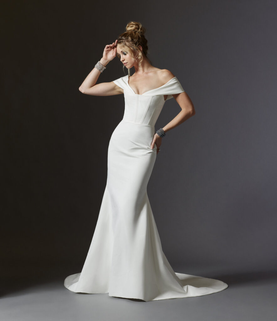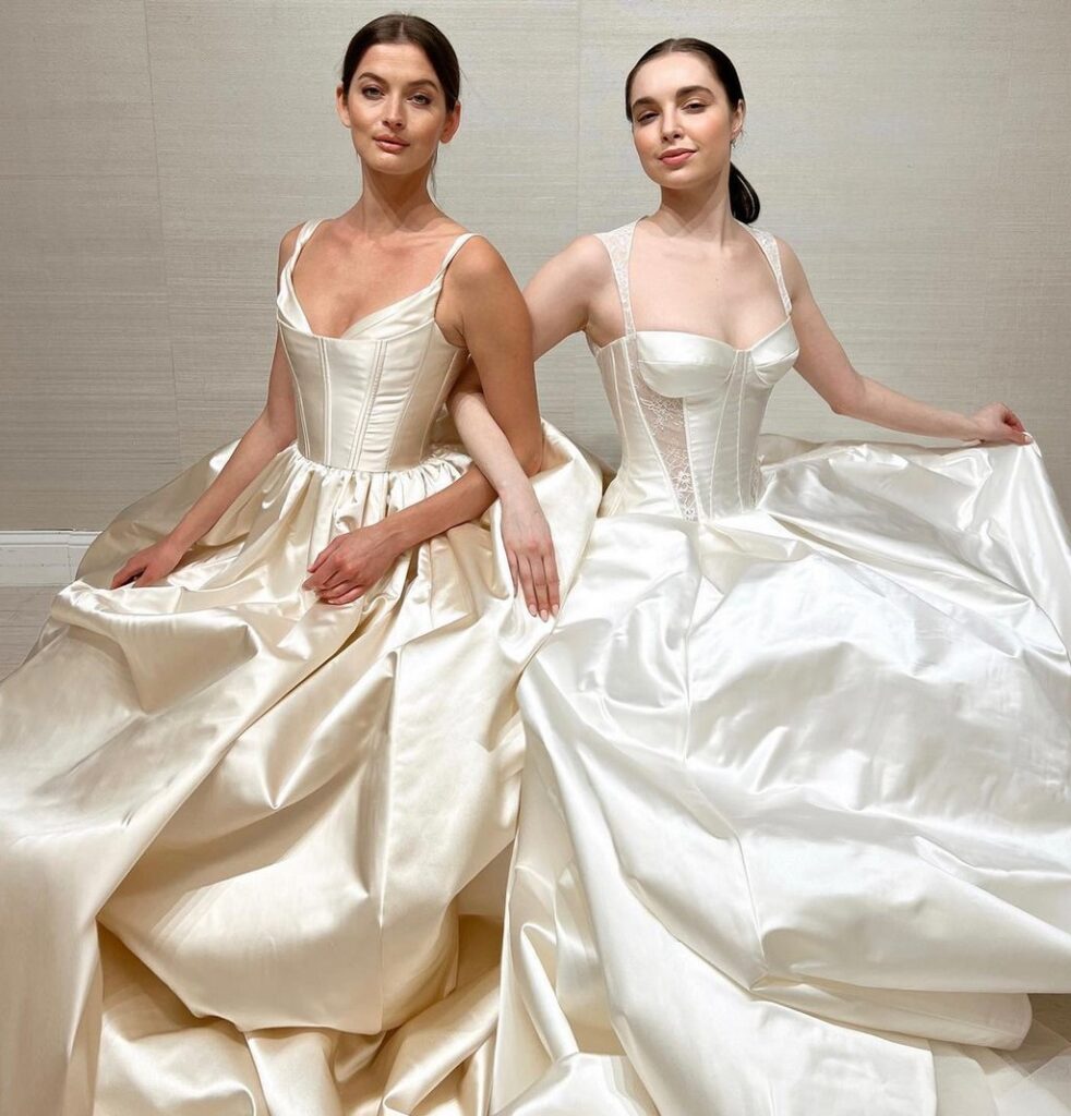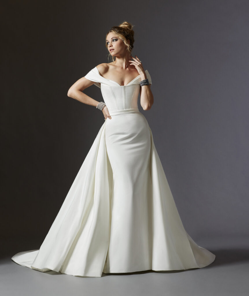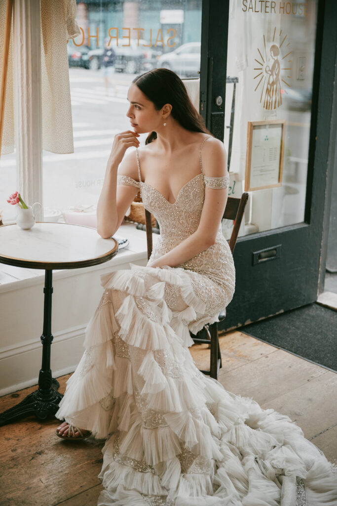 Nella collezione sposa, l’abito Venus – come visto ad inizio articolo - viene presentato accanto al modello “Jocelyn”, un abito da sposa A-line ricamato a mano con perline e petali, scollatura a cuore senza spalline, corpetto tempestato di gioielli, gonna ricamata a petali su tulle scintillante e strascico a cappella.