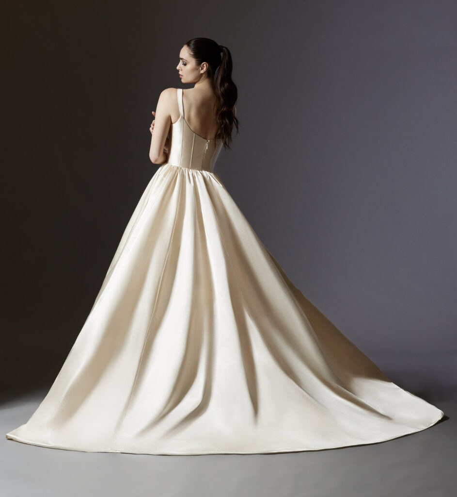 Bellissimo l’effetto lucente e regale dell’abito da sposa “Misty”, in raso di seta dal tono rosa antico, con corpetto a corsetto francese, scollo a cuore drappeggiato e spallina, vita naturale, gonna in raso arricciata con tasche laterali, strascico a cappella.