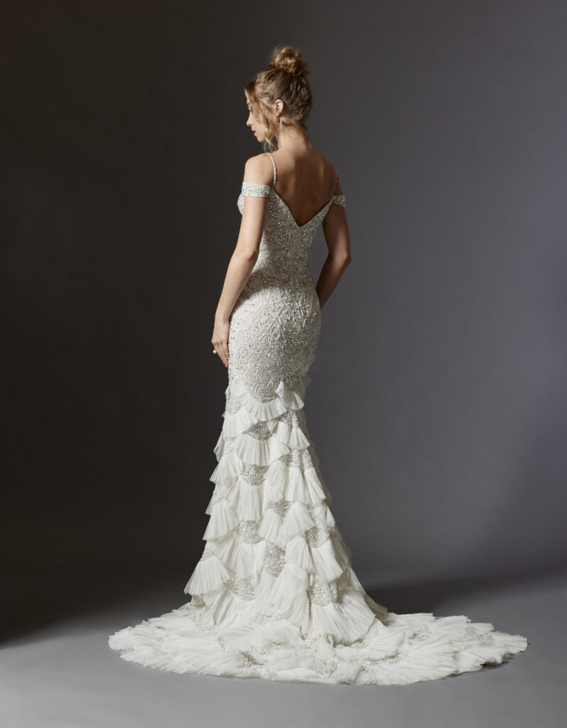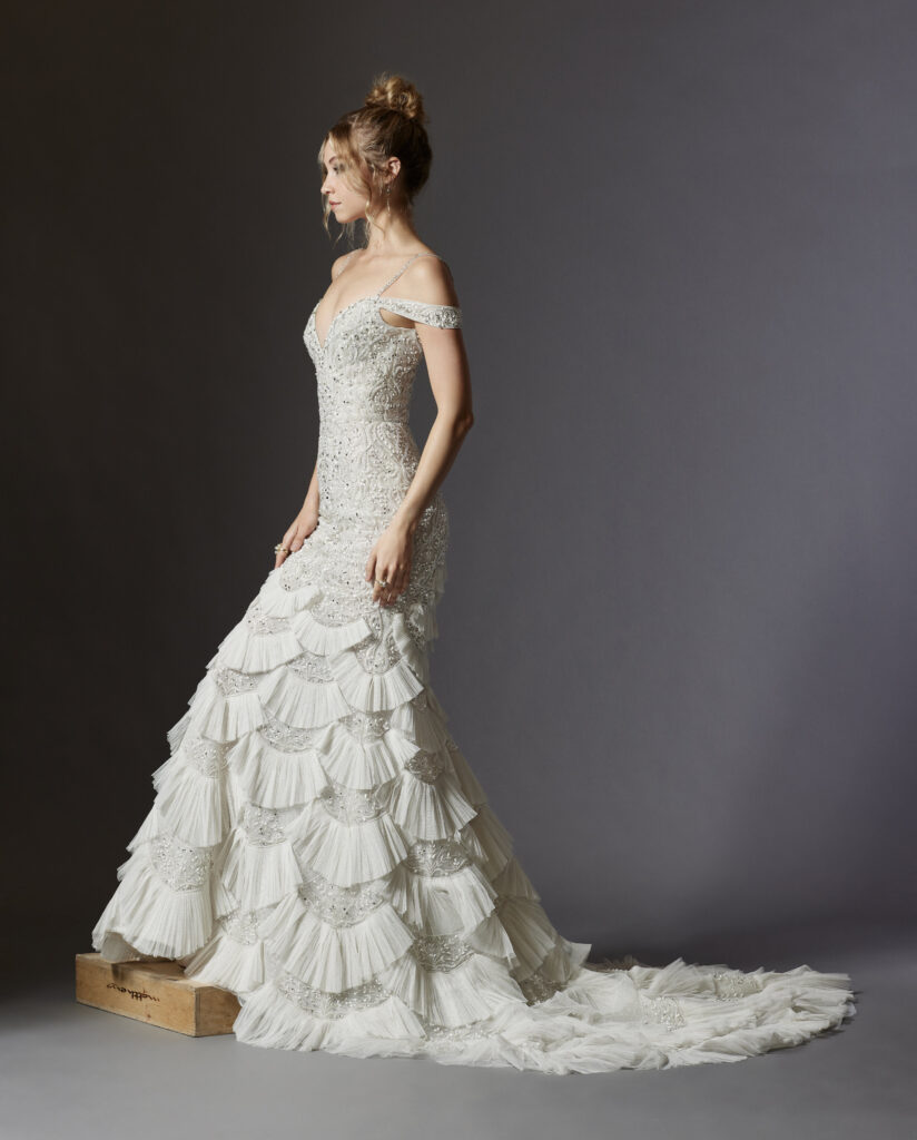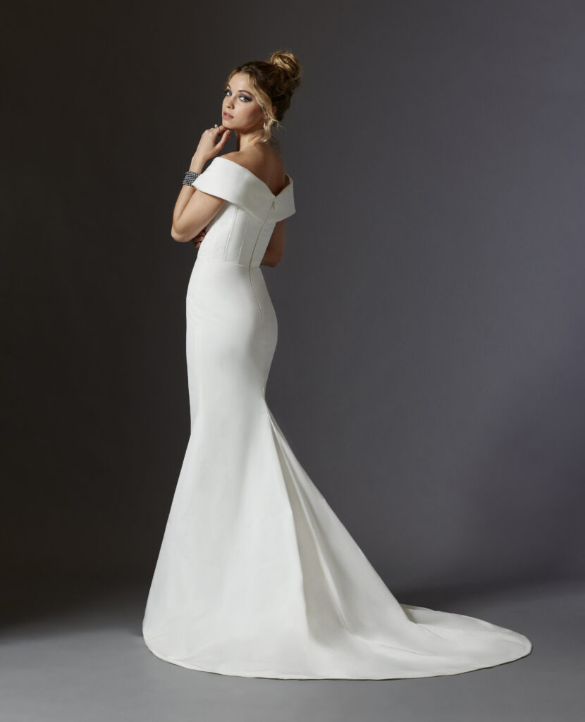 Con “Venus” ancora un modello svasato, questa volta in puro stile Art Déco, abbellito da perline e ricami fatti a mano, scollatura a cuore con cinturino di perline e manica a cappuccio fuori dalla spalla, vita naturale, gonna accentuata da tulle plissettato a smerli, strascico a cappella. Un abito da sposa da vera diva di Hollywood!