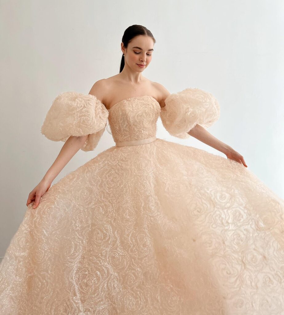 Davvero da fiaba l’abito da sposa rosa “Rosalind”, in tulle ricamato a nastro e scintillante, con scollatura orizzontale senza spalline, maniche a sbuffo staccabili, corpetto strutturato con cintura in nastro di crine in vita naturale, gonna circolare, strascico a cappella.