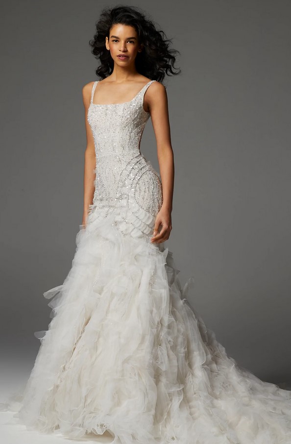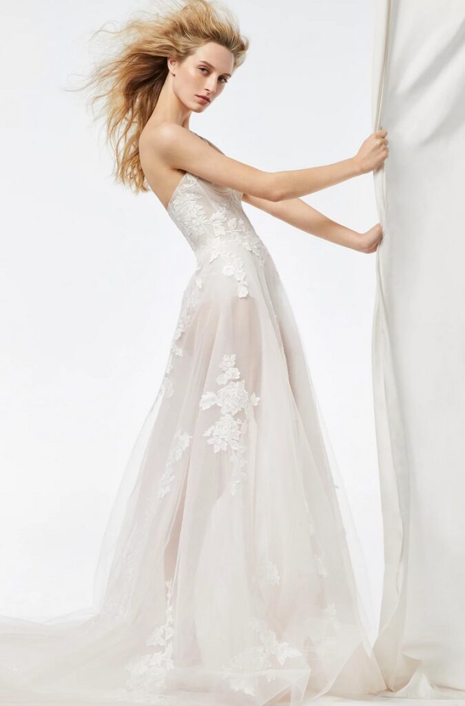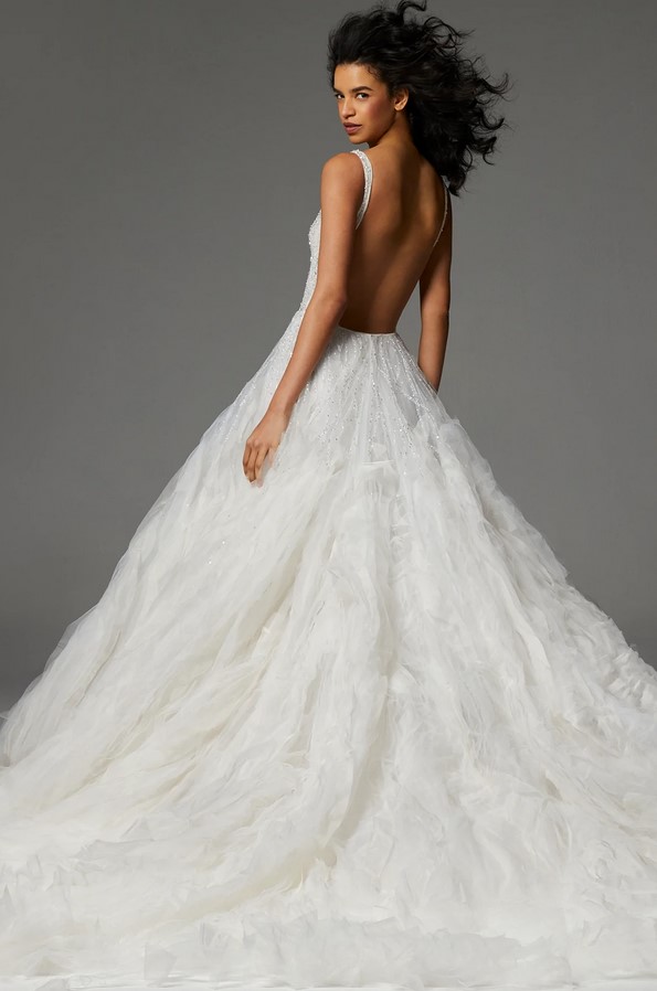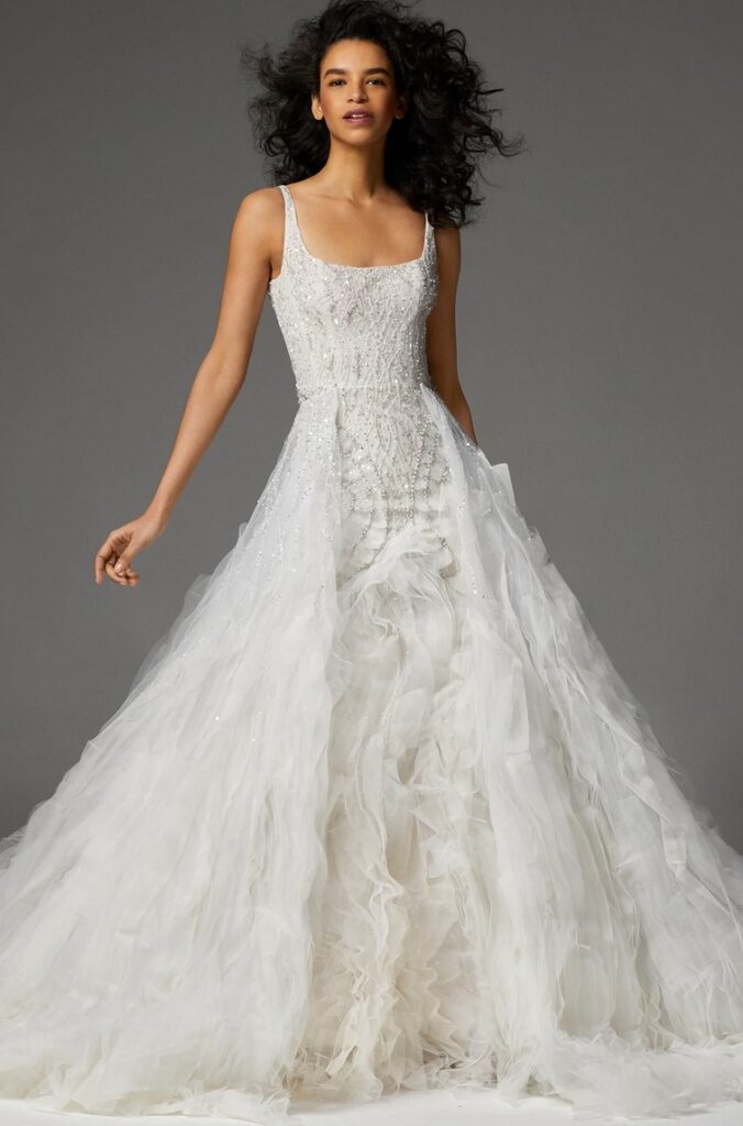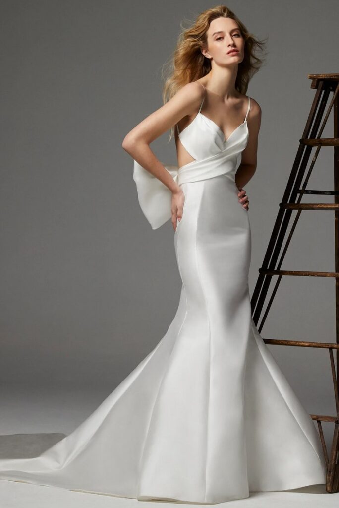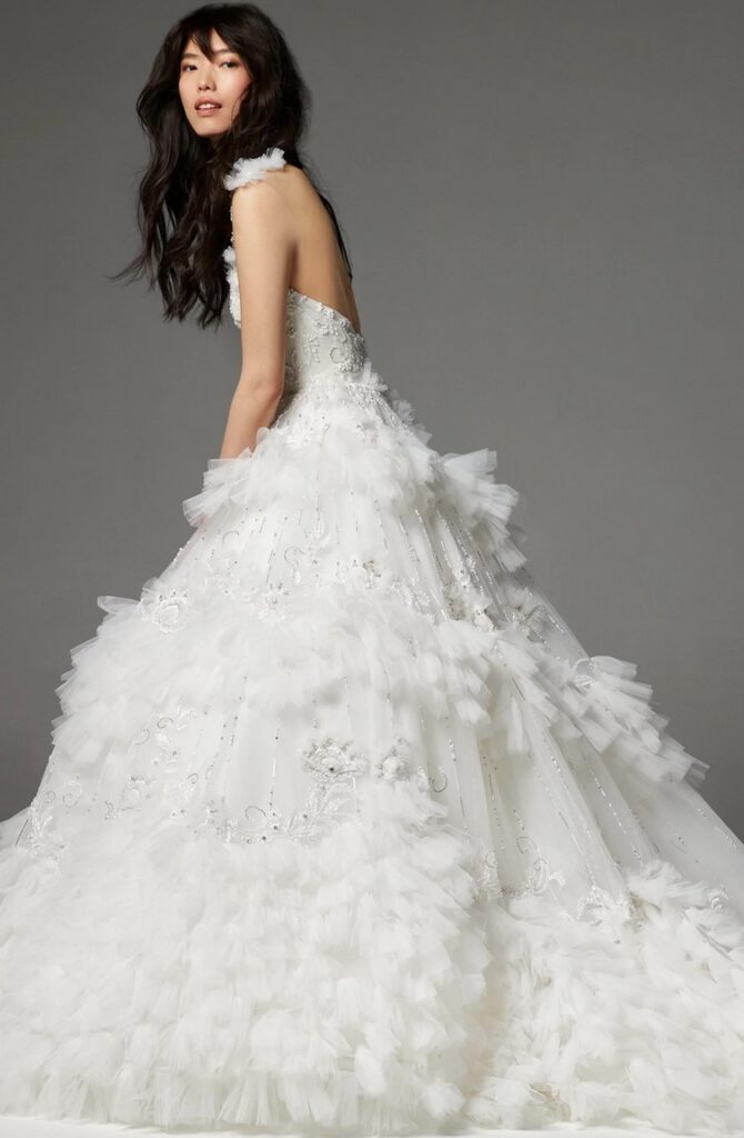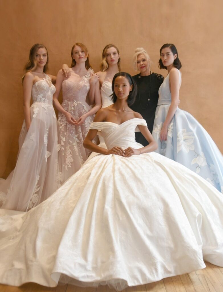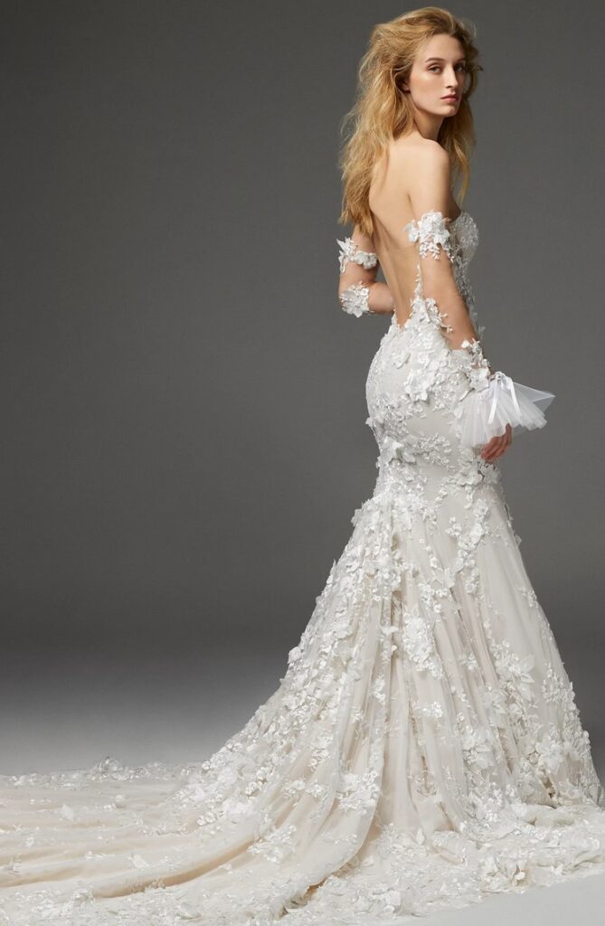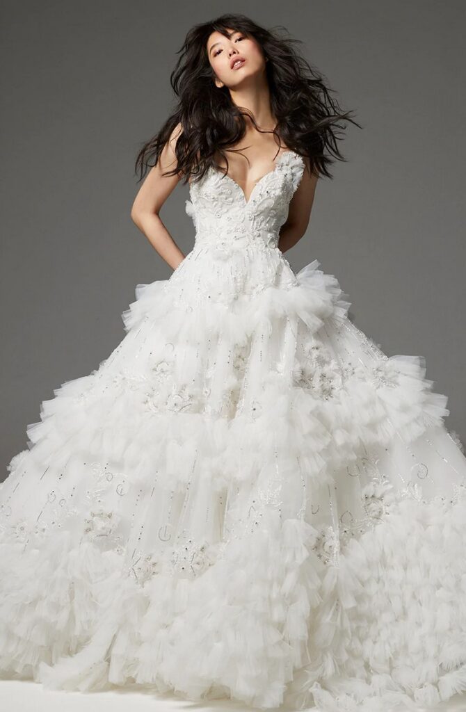 Una collezione davvero variegata, che propone abiti dalle diverse silhouette – l’abito da sposa a sirena, svasato, A-line e da principessa – realizzati in tessuti preziosi, con dettagli glam come piume e cristalli e molto versatile grazie all’offerta di accessori come le maniche e le sopragonne da aggiungere agli abiti.