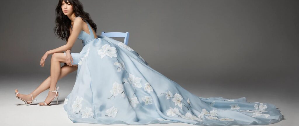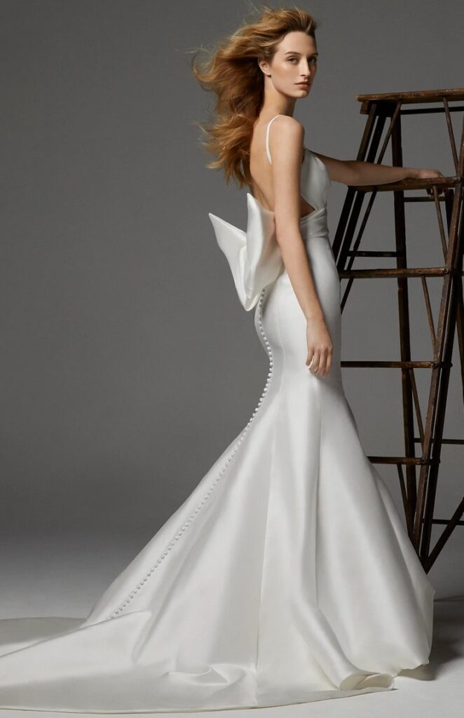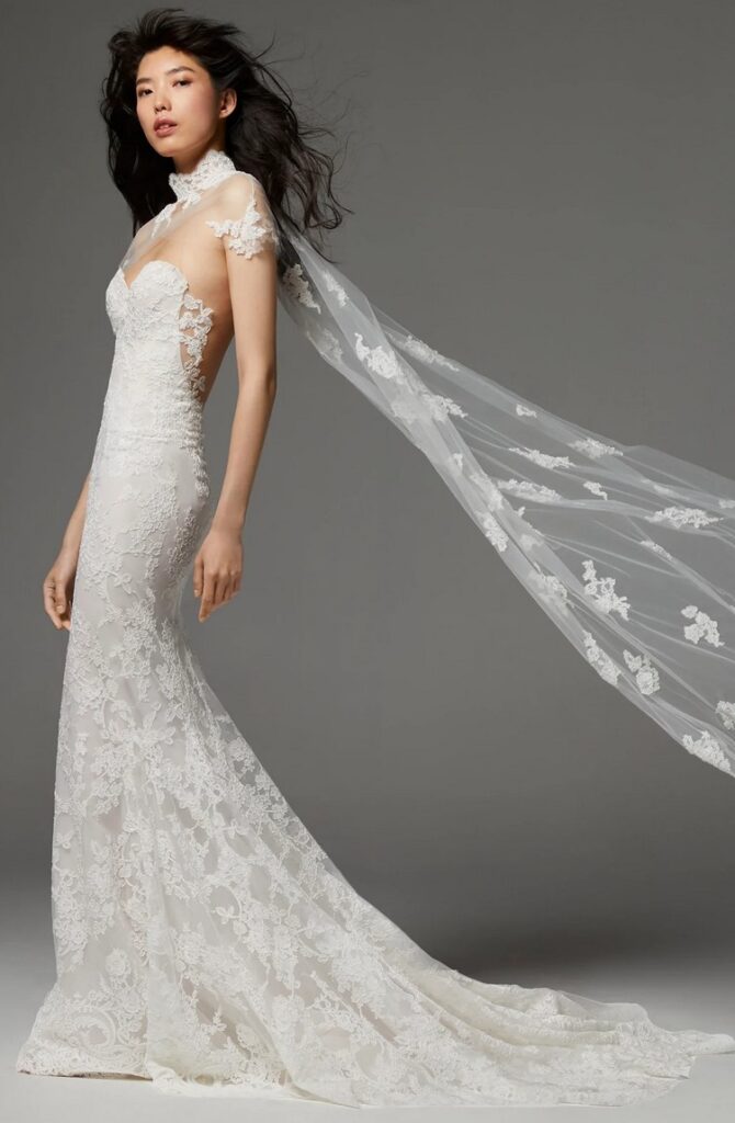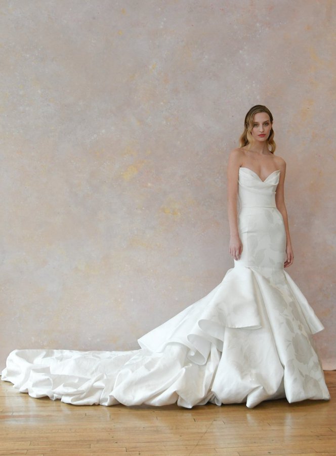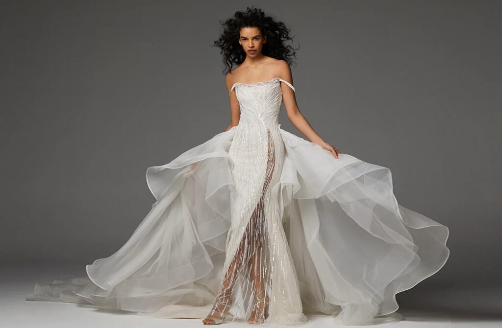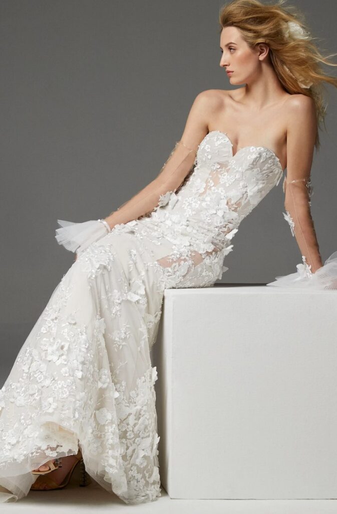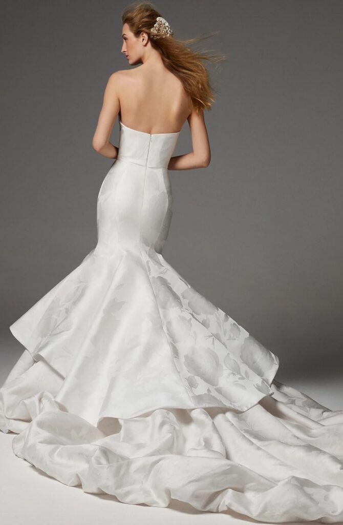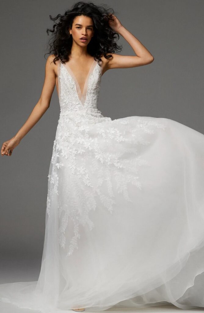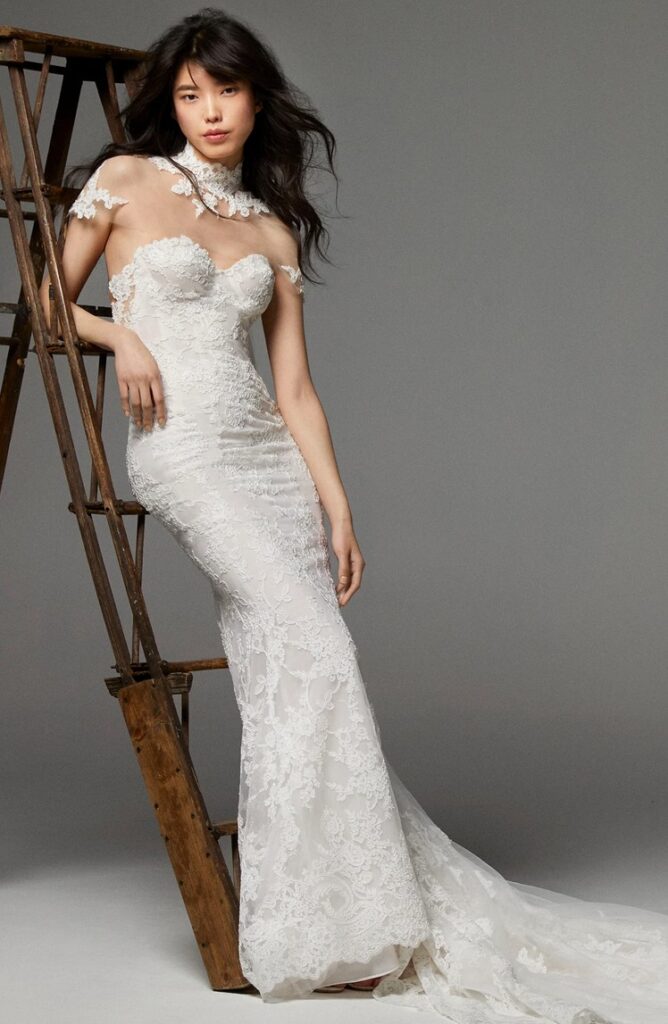 Una collezione davvero variegata, che propone abiti dalle diverse silhouette – l’abito da sposa a sirena, svasato, A-line e da principessa – realizzati in tessuti preziosi, con dettagli glam come piume e cristalli e molto versatile grazie all’offerta di accessori come le maniche e le sopragonne da aggiungere agli abiti.