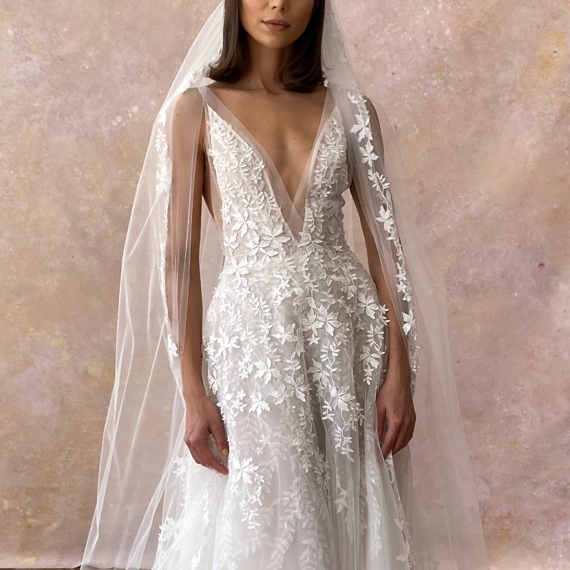 Due abiti da sposa in uno con due modelli: “Zaha”, abito svasato senza maniche con scollo quadrato, gonna strutturata e scollatura quadrata sulla schiena, cui può essere abbinata una sopragonna testurizzata per un'entrata in grande stile; “Amal”, abito a tubino con fitti ricami verticali in perline e scollo quadrato sul retro, cui può essere aggiunta una sopragonna testurizzata in organza.