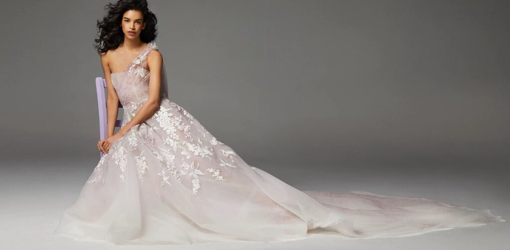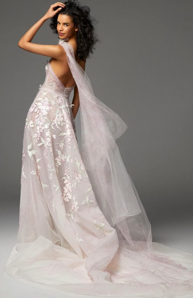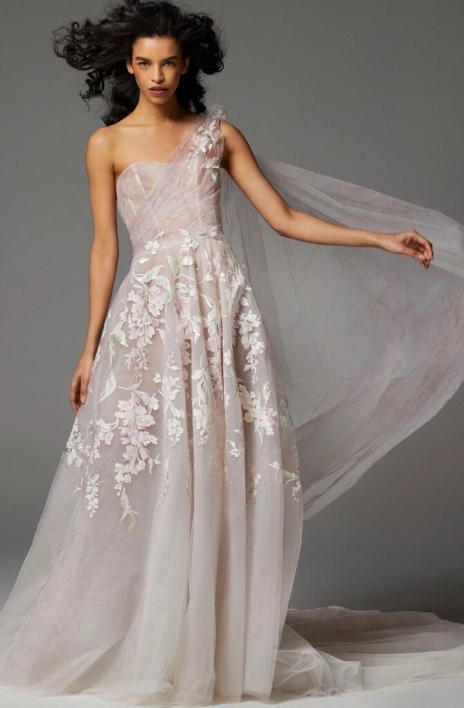 Sempre perfetto per la sposa originale è “Nour”, abito da sposa monospalla A-line drappeggiato in organza dipinta a mano in tinte pastello con applicazione floreali 3D.