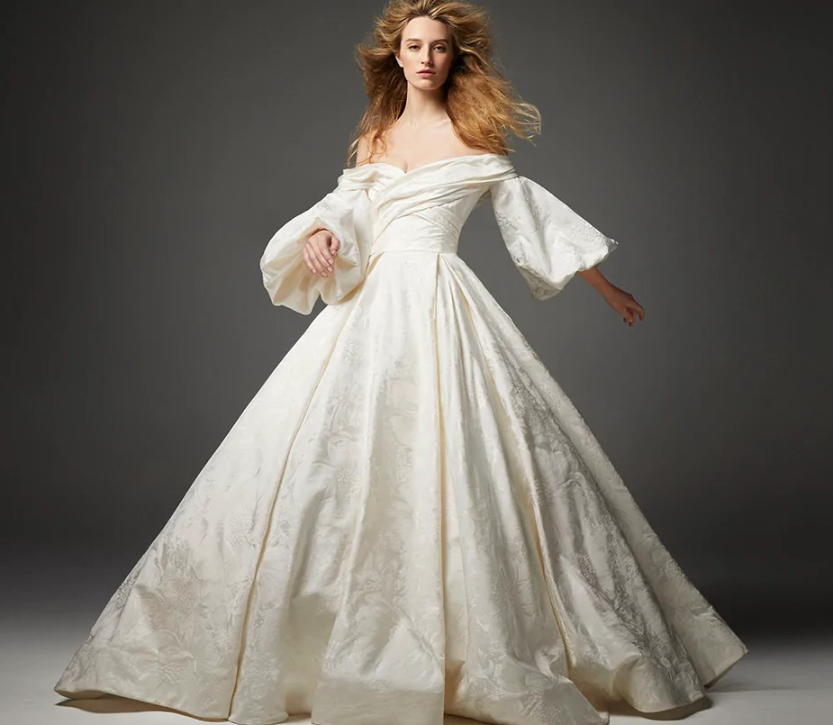 Davvero principesco “Paris”, un ball gown drappeggiato con scollo a cuore e scenografiche maniche a palloncino rimovibili.